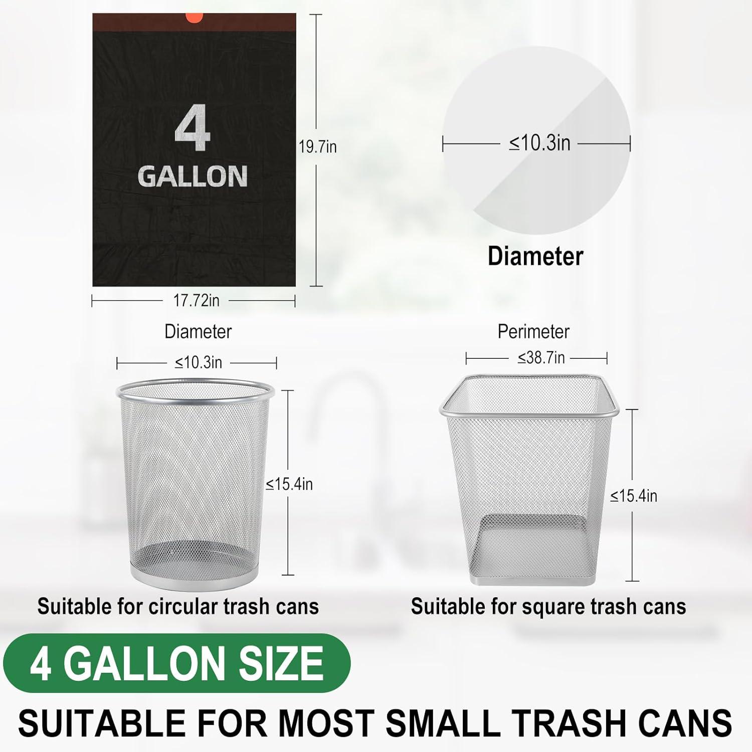 Size: Our 4 gallon trash bags are 17.7’ W x 19.6’ H, suitable for most 15L trash cans.