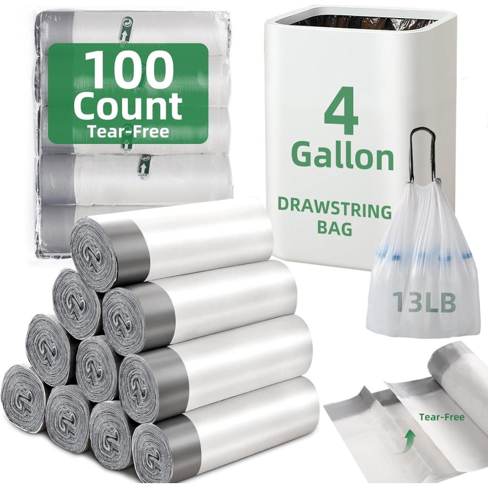 Be the first to review “100 Counts 4 Gallon Trash Bag Drawstring Small Trash Bags, Thick Pre-separated Garbage Bags, Trash Bin Liners, Suitable for bathroom, kitchen, bedroom, office (Black)(White-100-4Gal)”