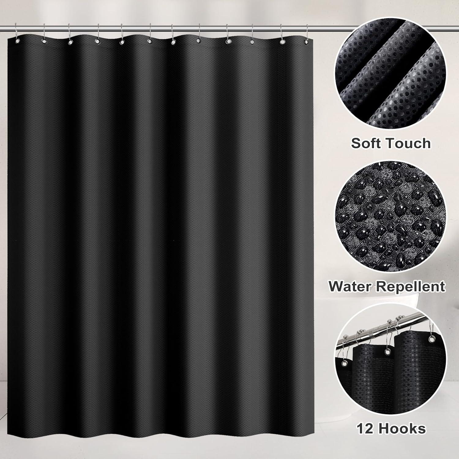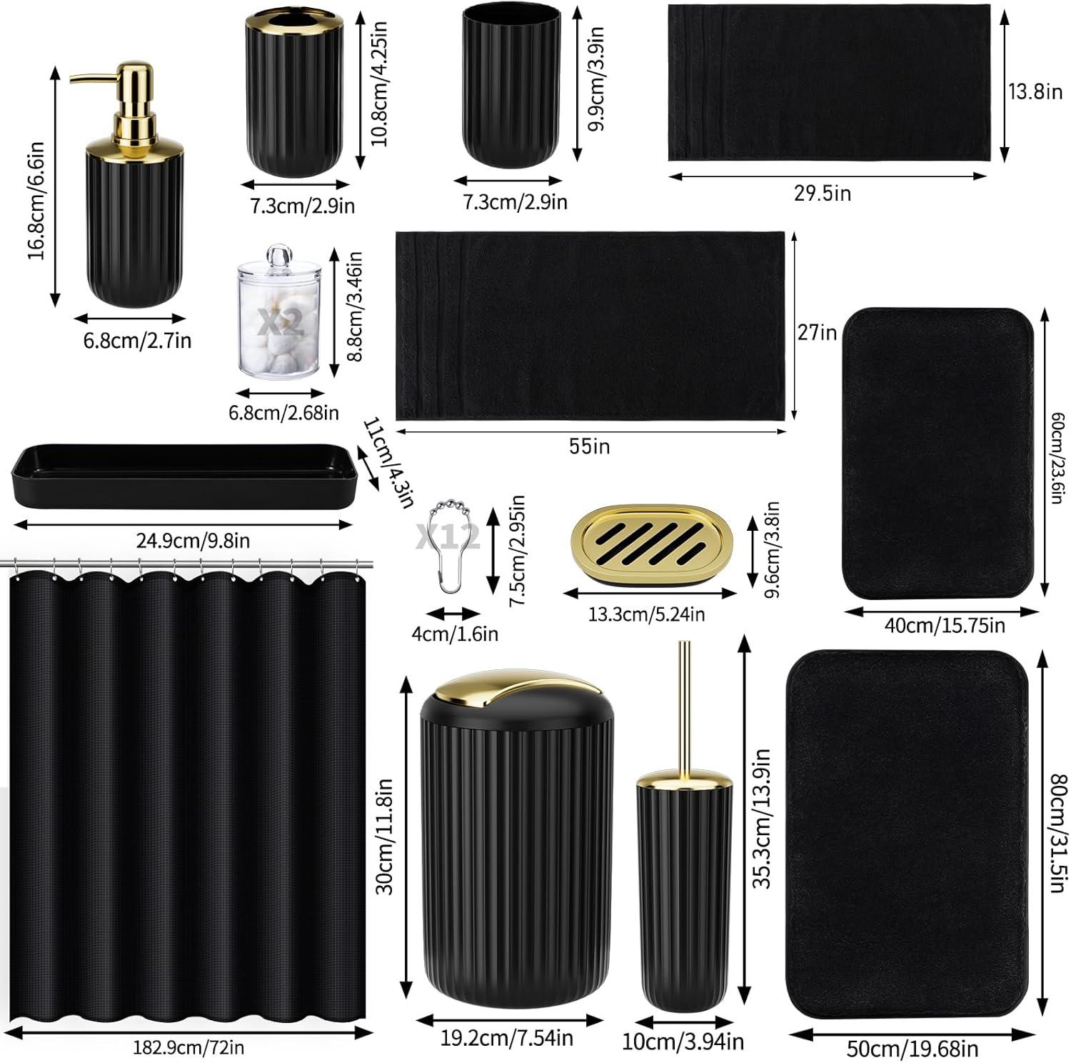 BATHROOM ACCESSORY SET WITH SHOWER CURTAIN – Our bathroom set includes 1 x toothbrush holder, 1 x toothbrush cup, 1 x lotion soap dispenser, 1 x soap dish, 1 x toilet brush,1 x trash can,1 x Vanity Tray,2 x Qtip, Shower Curtain with 12 Stainless Steel Hooks,2 x Bathroom Rug. A complete set of all-in-one bathroom essentials that are easily accessible!
