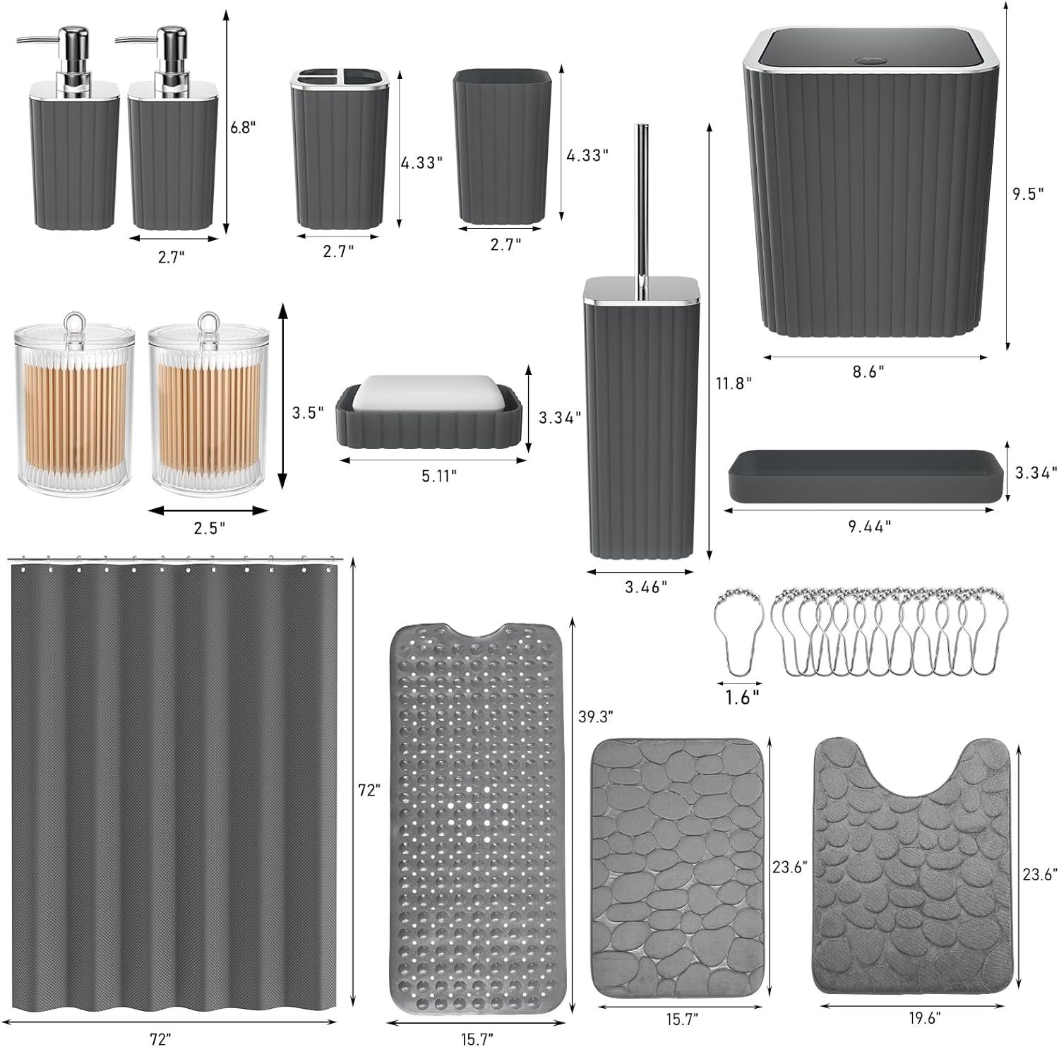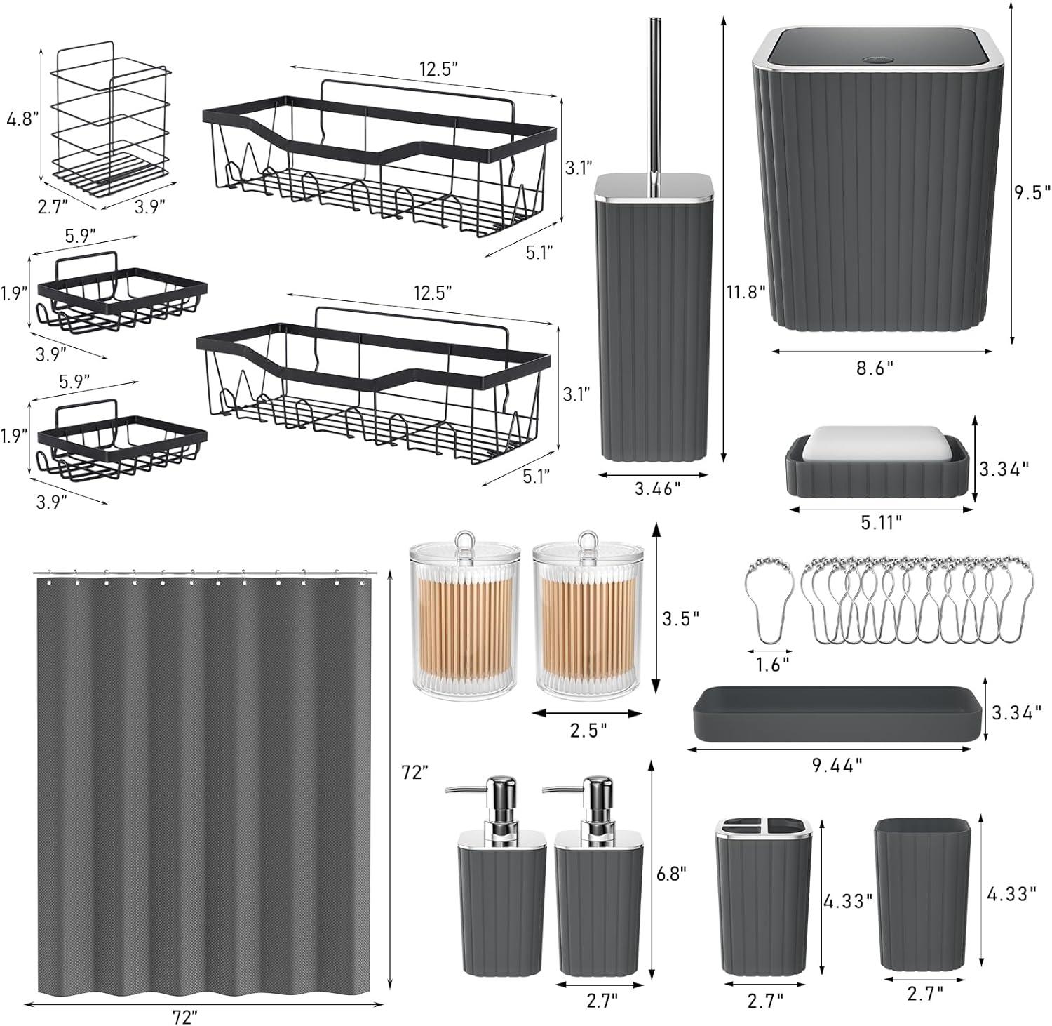BATHROOM ACCESSORIES SET: This 28-Piece Bathroom accessory set is made of durable plastic that can outlast other products. Item includes 5 x shower caddies, 2 x soap dispenser, 1 x toothbrush holder, 1 x bathroom tumbler, 1 x vanity tray, 1 x soap dish, 1 x toilet brush, 1 x trash can, 2 x plastic jars, 1 x shower curtain, 12 x hooks. Our high quality plastic bath accessories will resist to constant use.