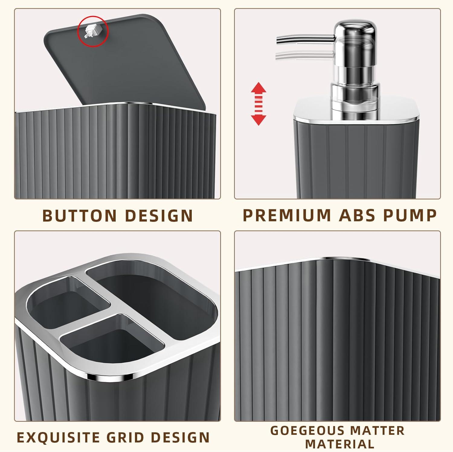 MATERIAL: Bathroom accessories set made out of premium plastic, think and sturdy. The pump head is coated stainless steel paint, prevent rust and corrosion. The various accessories inside satisfy your use of the bathroom set. Buy this bathroom sets accessories, you will not need to purchase additional products. Our set is fully covered.