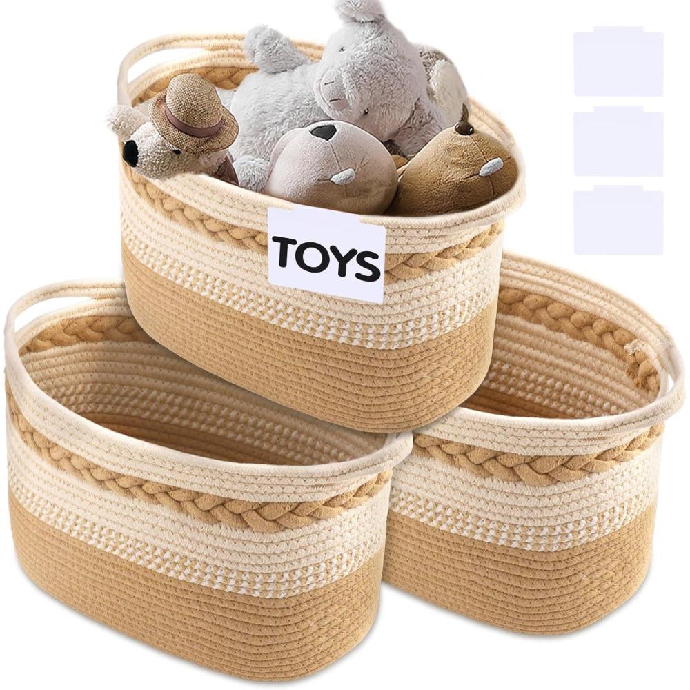 image3 Pack Rope Basket Beige Storage Baskets with Handle and Labels 13x9x9 Inch Woven Baskets Cotton Rope Woven Baskets for Organizing  Perfect for Kids Dog Toys Books Towels ShelvesBrown