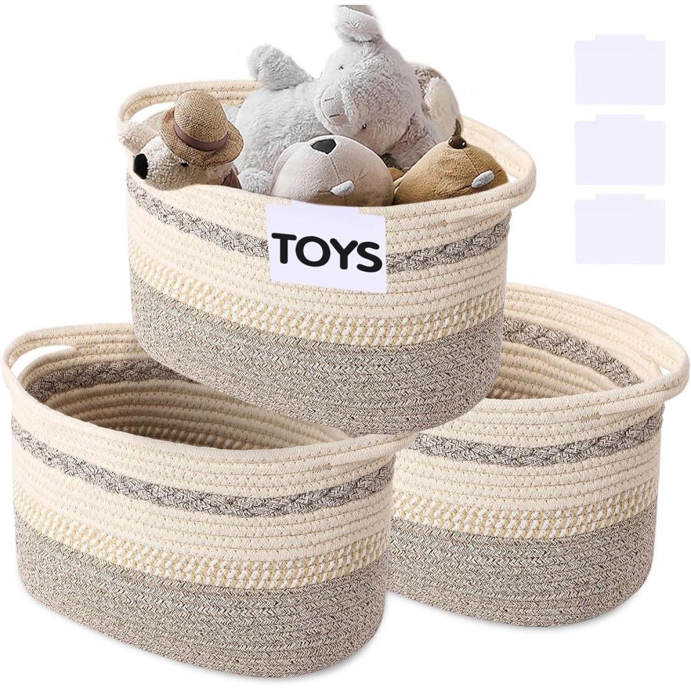 3 Pack Rope Basket, Beige Storage Baskets with Handle and Labels, 13x9x9 Inch Woven Baskets Cotton Rope Woven Baskets for Organizing – Perfect for Kids, Dog Toys, Books, Towels, Shelves(Beige)