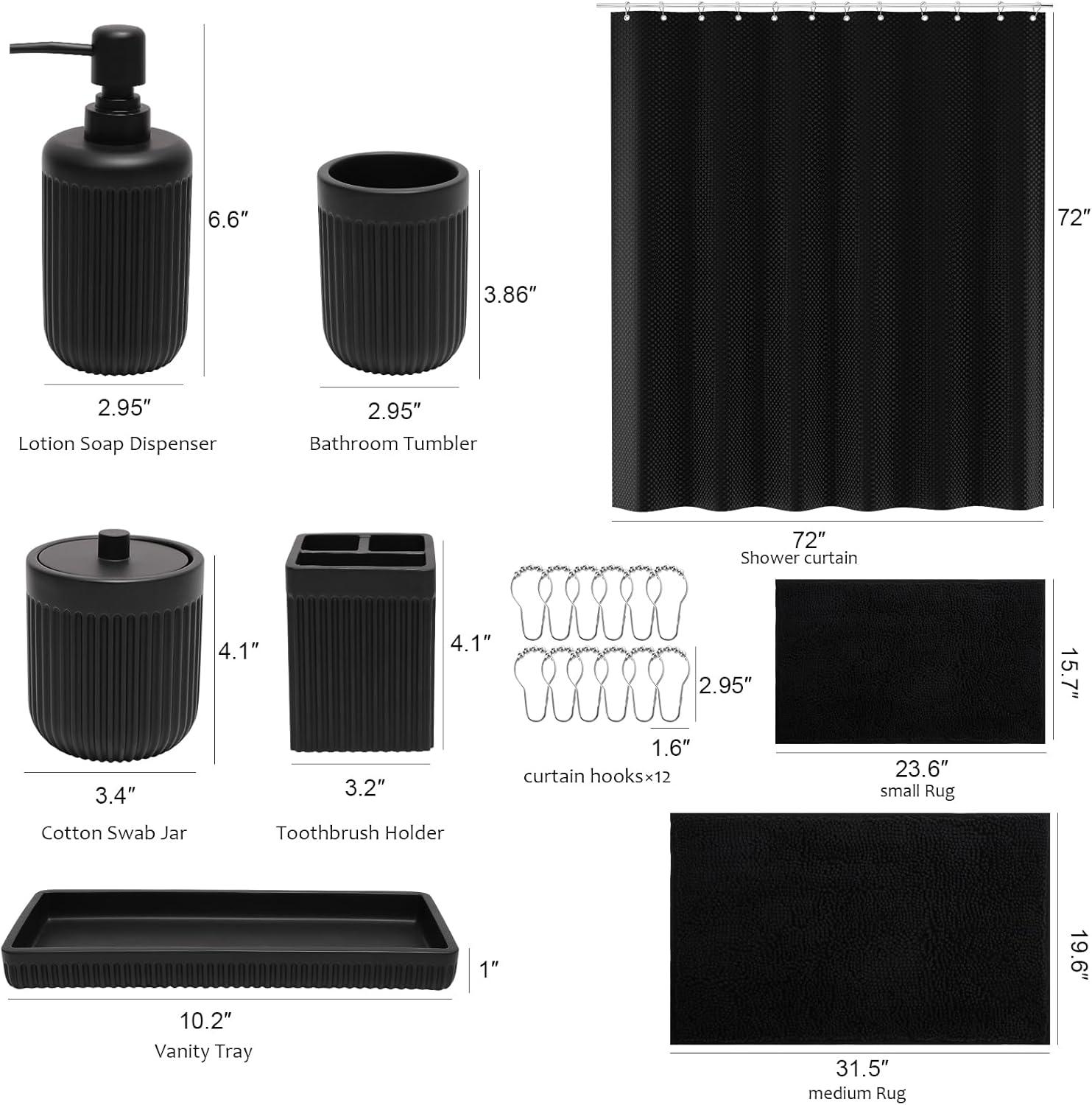 8-Piece Matte Black Bathroom Set - Luxury Resin Bathroom Accessories Sets Complete with Shower Curtain and Rugs, Soap Dispenser, Toothbrush Holder, Cup, Apothecary Jars & Tray(Black)