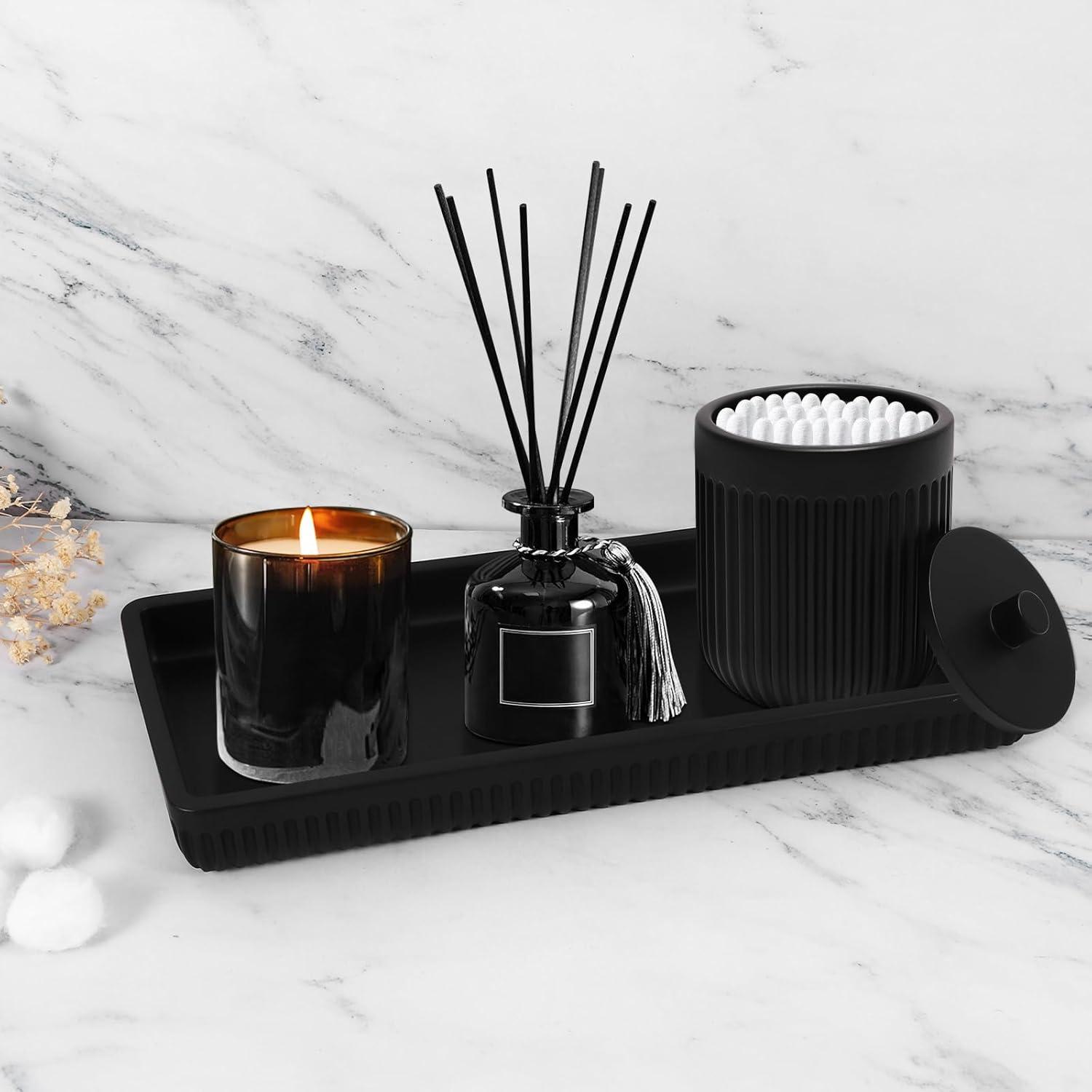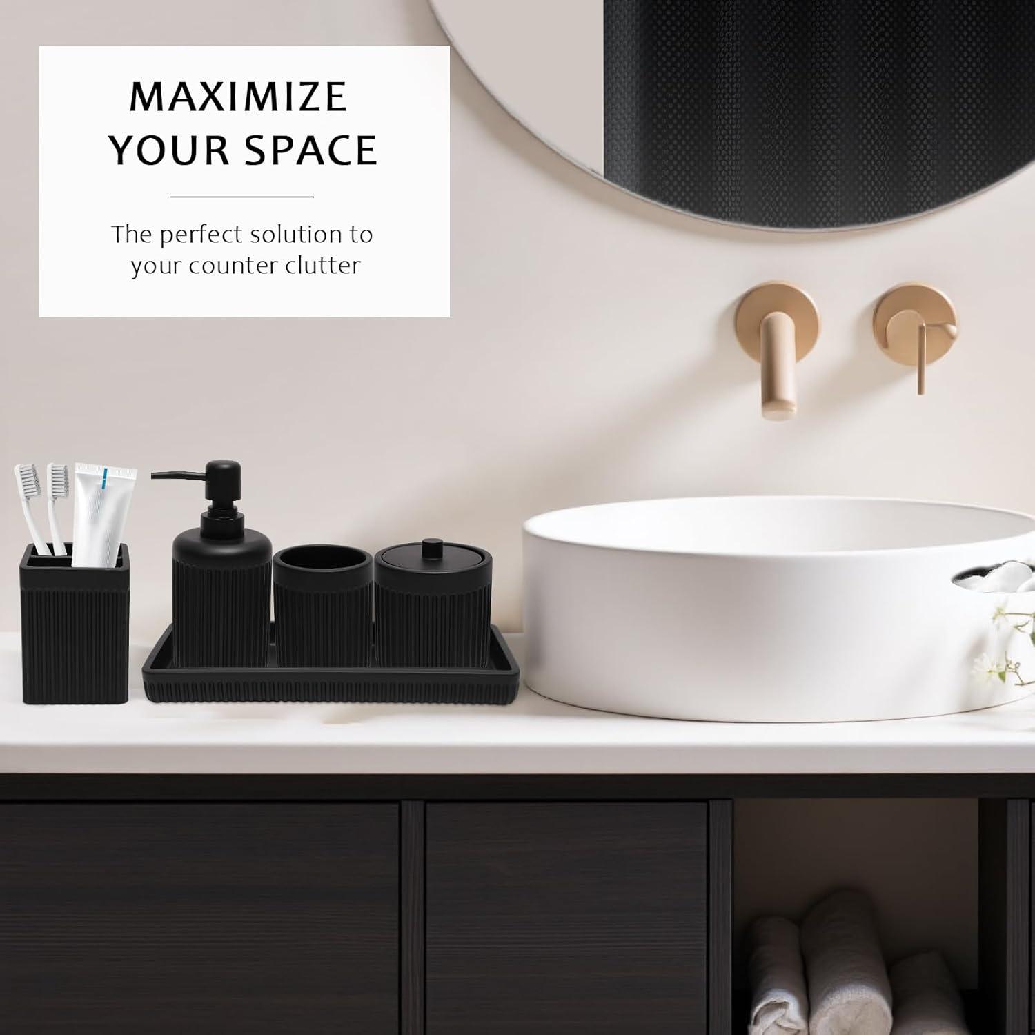 【Elegant Design Meets Everyday Functionality】:Designed to complement any bathroom style, this set combines elegance with practicality. The vanity tray corrals lotions/soaps while the deep-cup tumbler organizes razors or makeup brushes. From soap dispensers and toothbrush holders to your shower curtain and rugs, this set has everything you need. The included tray keeps your essentials neatly arranged, making even the smallest bathroom feel more spacious