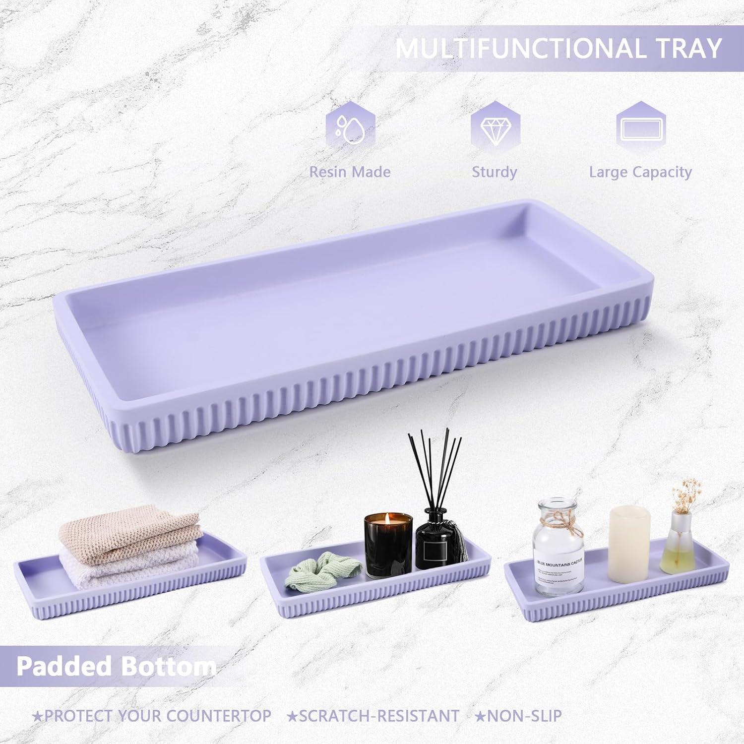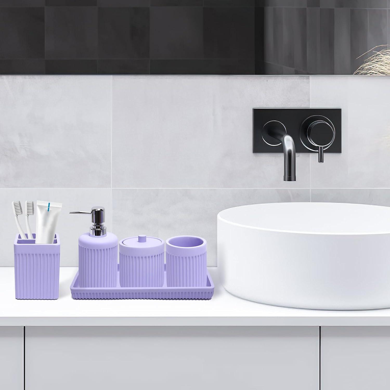 【Elegant Design Meets Everyday Functionality】:Designed to complement any bathroom style, this set combines elegance with practicality. The vanity tray corrals lotions/soaps while the deep-cup tumbler organizes razors or makeup brushes. From soap dispensers and toothbrush holders to your shower curtain and rugs, this set has everything you need. The included tray keeps your essentials neatly arranged, making even the smallest bathroom feel more spacious