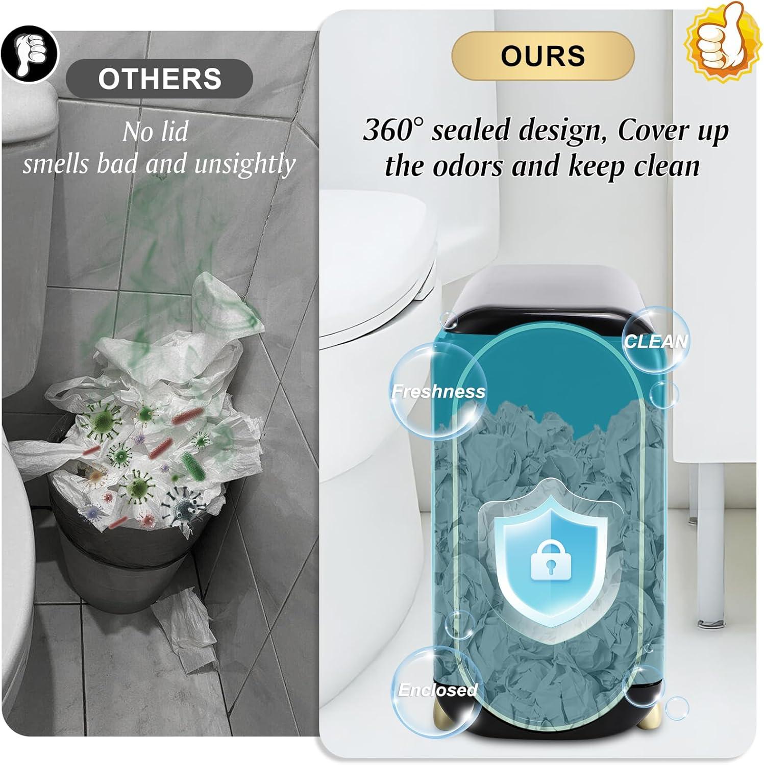ใ€๐๐ซ๐ž๐ฌ๐ฌ-๐จ๐ง ๐‹๐ข๐ ๐ƒ๐ž๐ฌ๐ข๐ ๐งใ€‘Slim trash can features a pop-up lid, which can be opened or closed with a light press, making it cleaner with one-handed operation. The press-on lid allows you to store it in a conspicuous place; the trash is out of sight. The lid closes after pressing to prevent odors from escaping