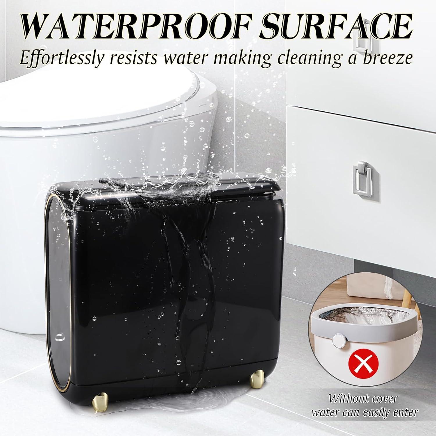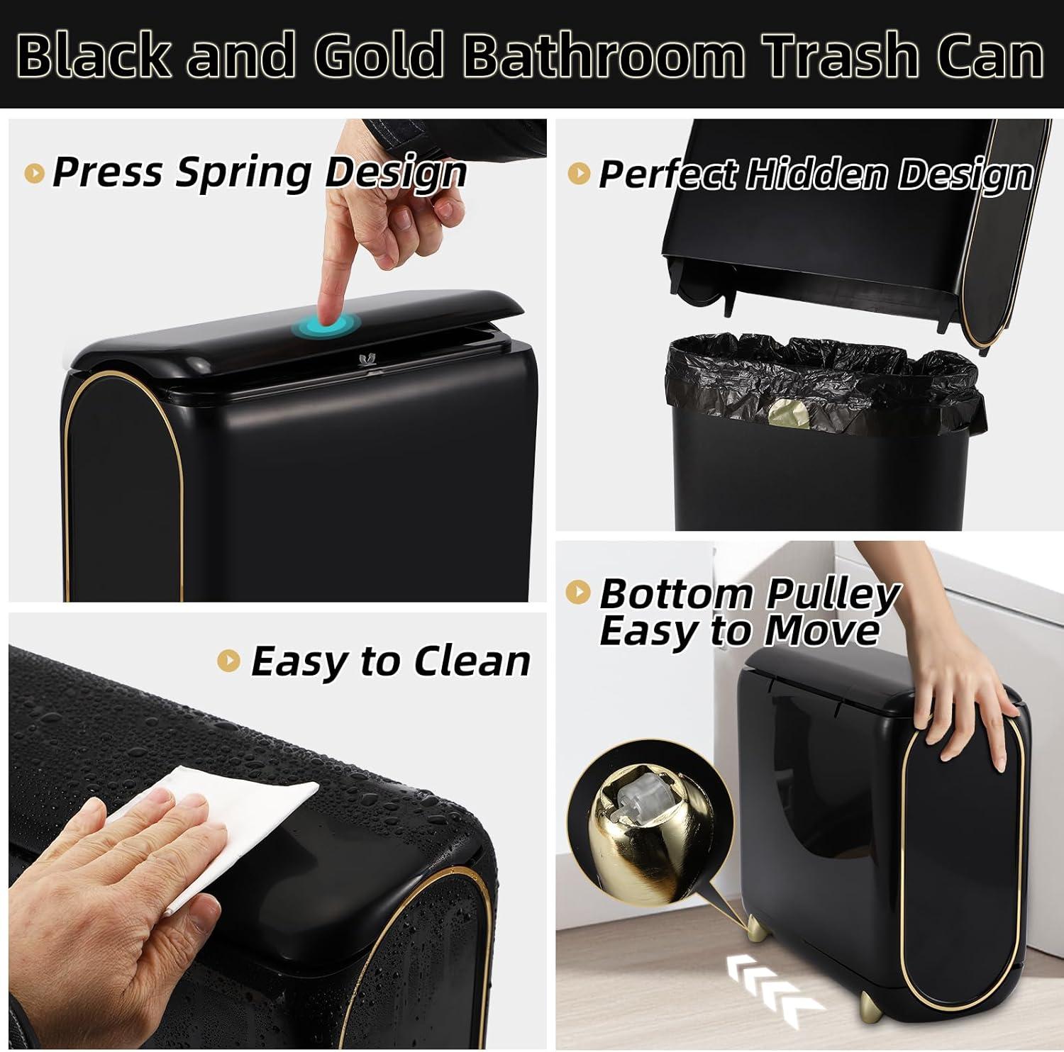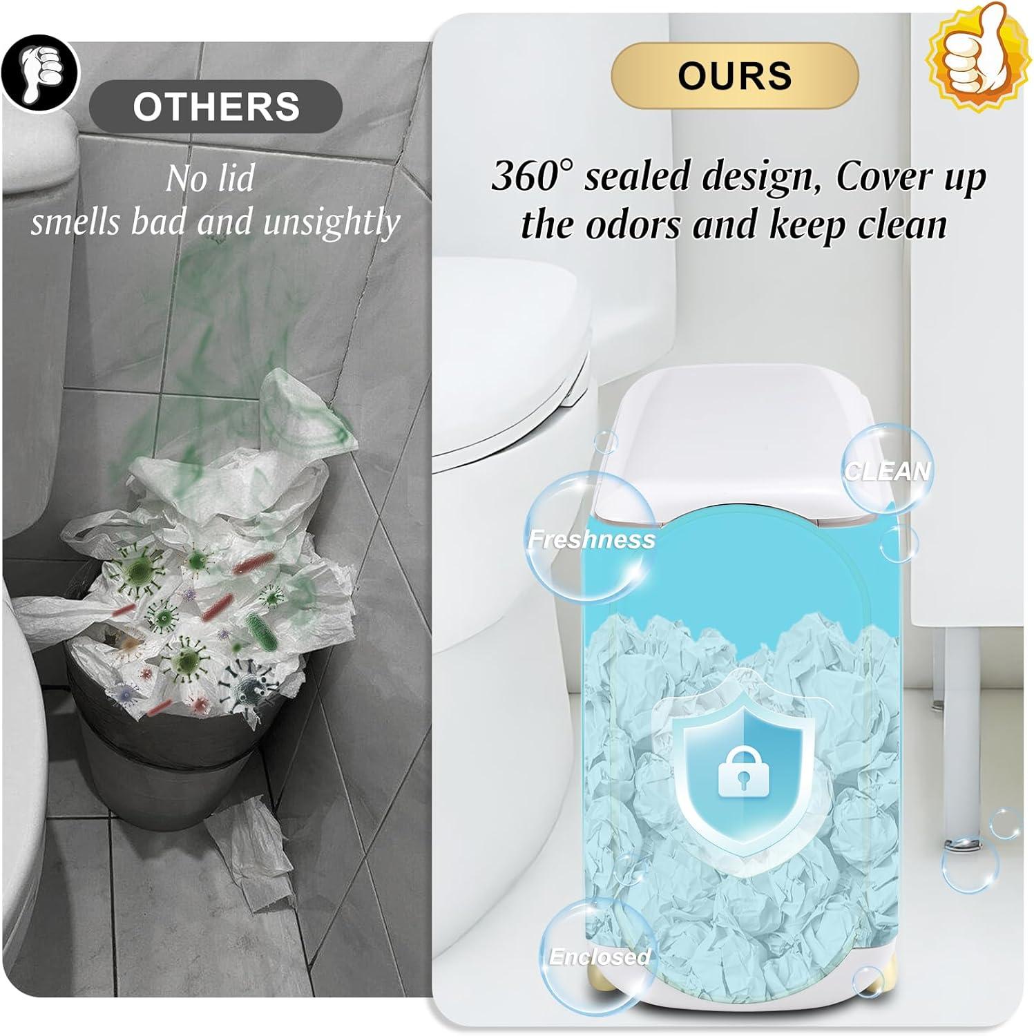 ใ€๐‚๐จ๐ฆ๐ฉ๐š๐œ๐ญ ๐š๐ง๐ ๐’๐ฉ๐š๐œ๐ž-๐ฌ๐š๐ฏ๐ข๐ง๐ ใ€‘White and gold bathroom trash can with lid features a modern and slim design, perfect for small spaces. It is perfect for corners and narrow areas such as kitchens, bedrooms and bathrooms. The trash can with wheels can be pushed and moved, making it easy to clean (50% more efficient than wheelless models)