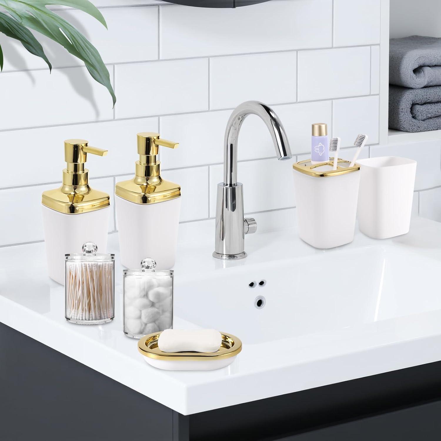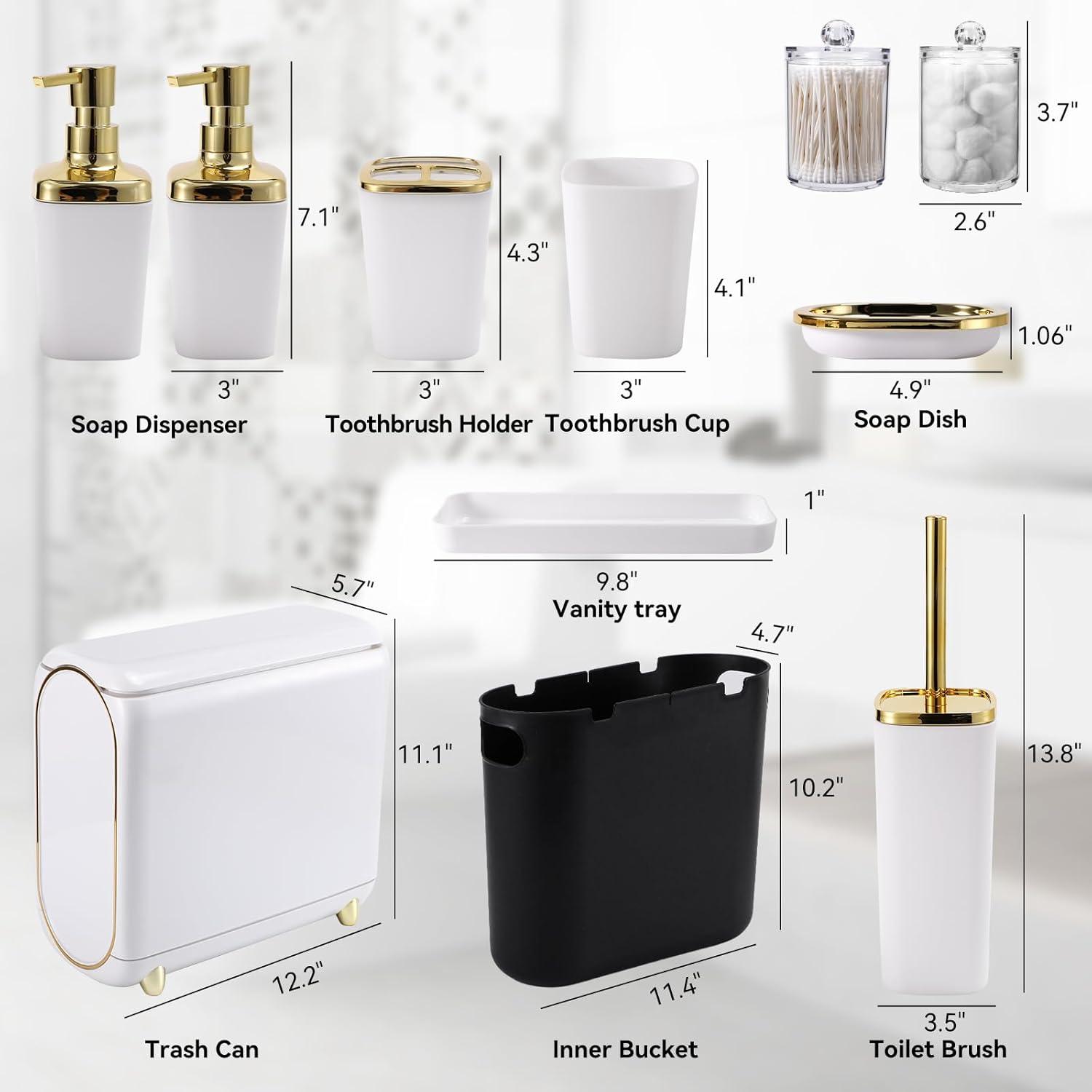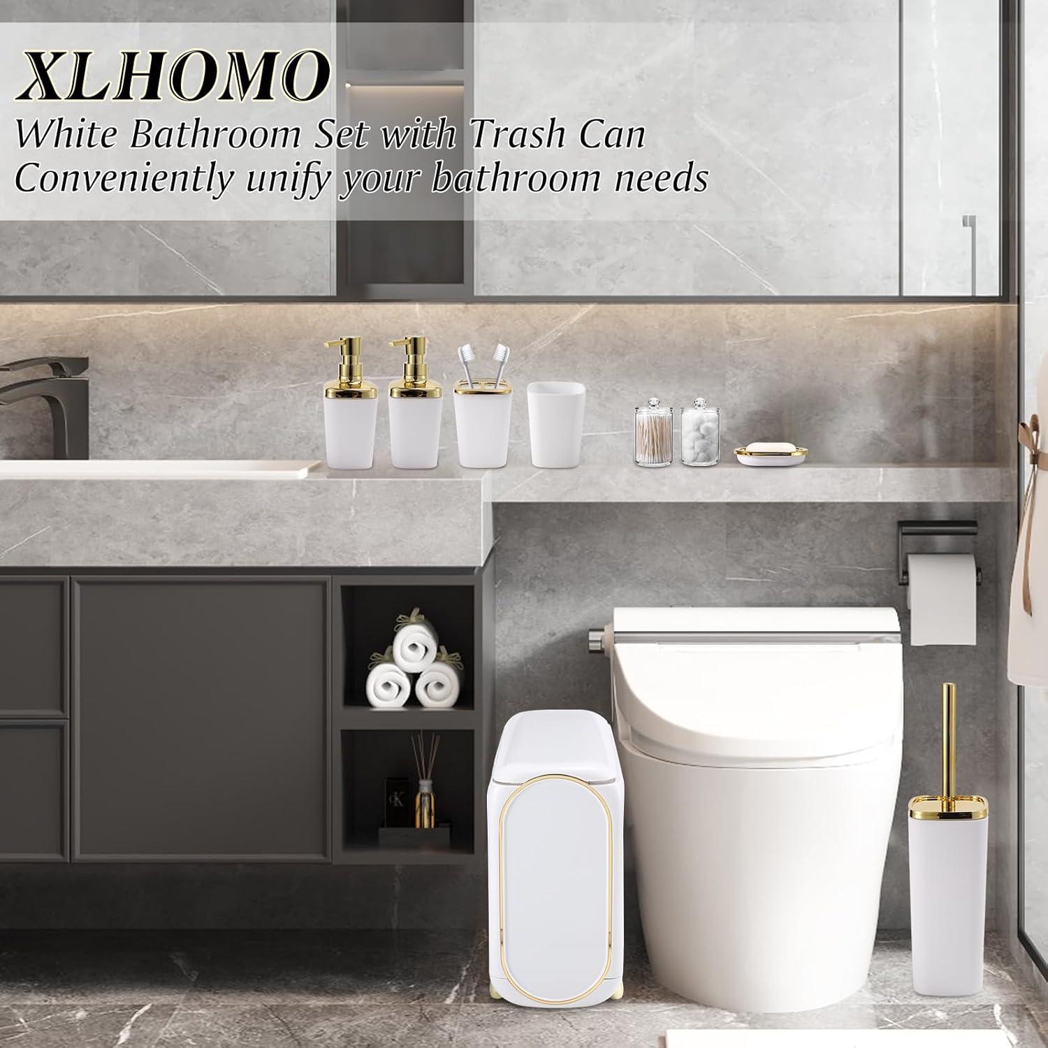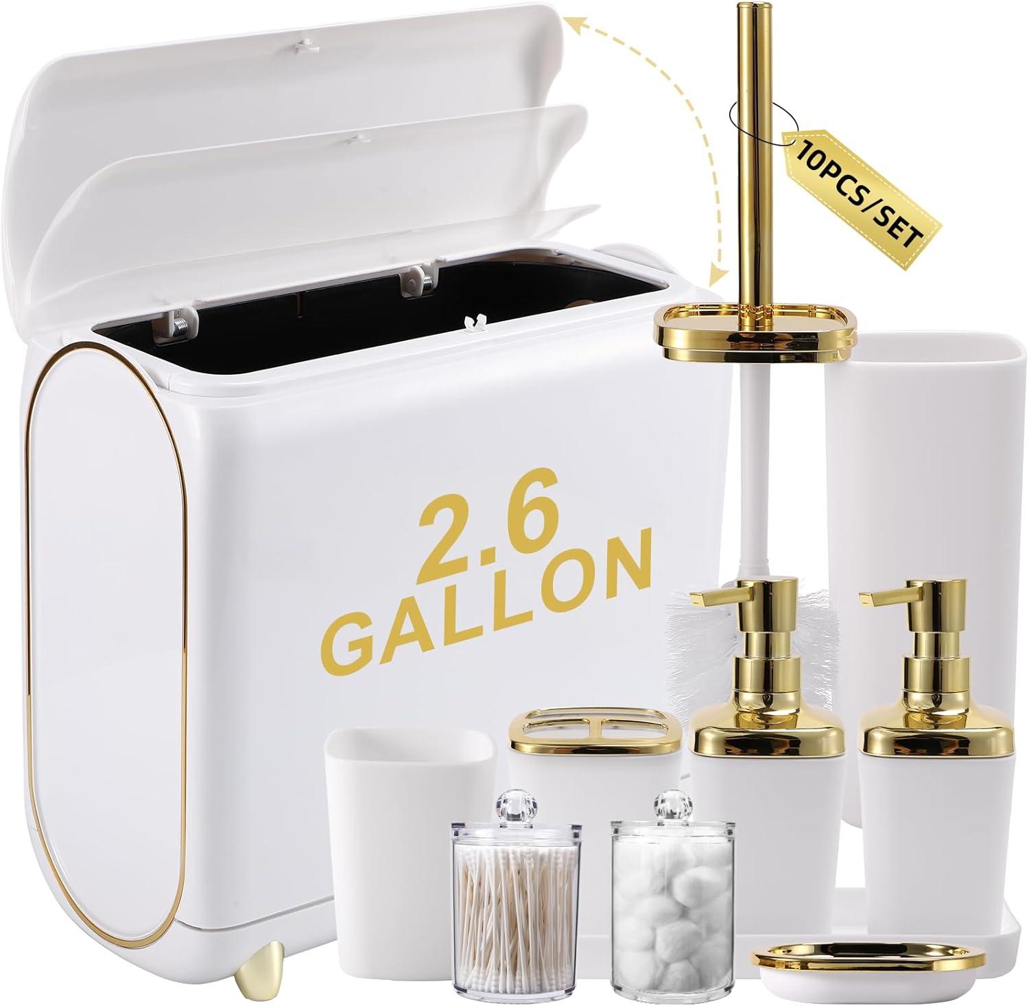 Bathroom Accessories Set, 10 Pieces White and Gold Bathroom Set, Bathroom Accessory Set with Slim Trash Can,Soap Dispenser,Toilet Brush,Toothbrush Set, Qtip Holders for Housewarming(Bath Set)