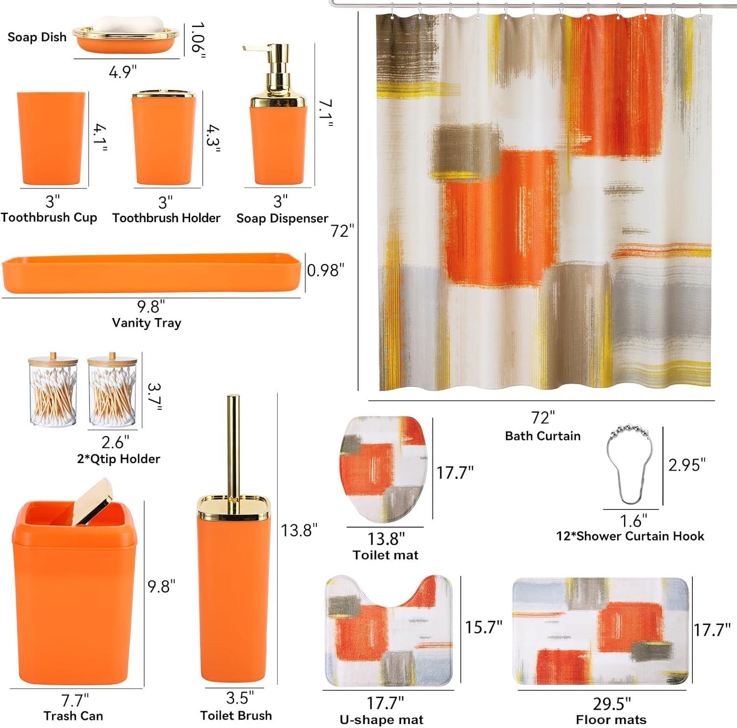 Bathroom Set – Orange Bathroom Accessories Set, Bathroom Sets with Shower Curtain and Rugs, Orange Shower Curtain Set with Bathroom Trash Can, Soap Dispenser, Soap Dish for Home Decor(Plaid Grey & Gold)
