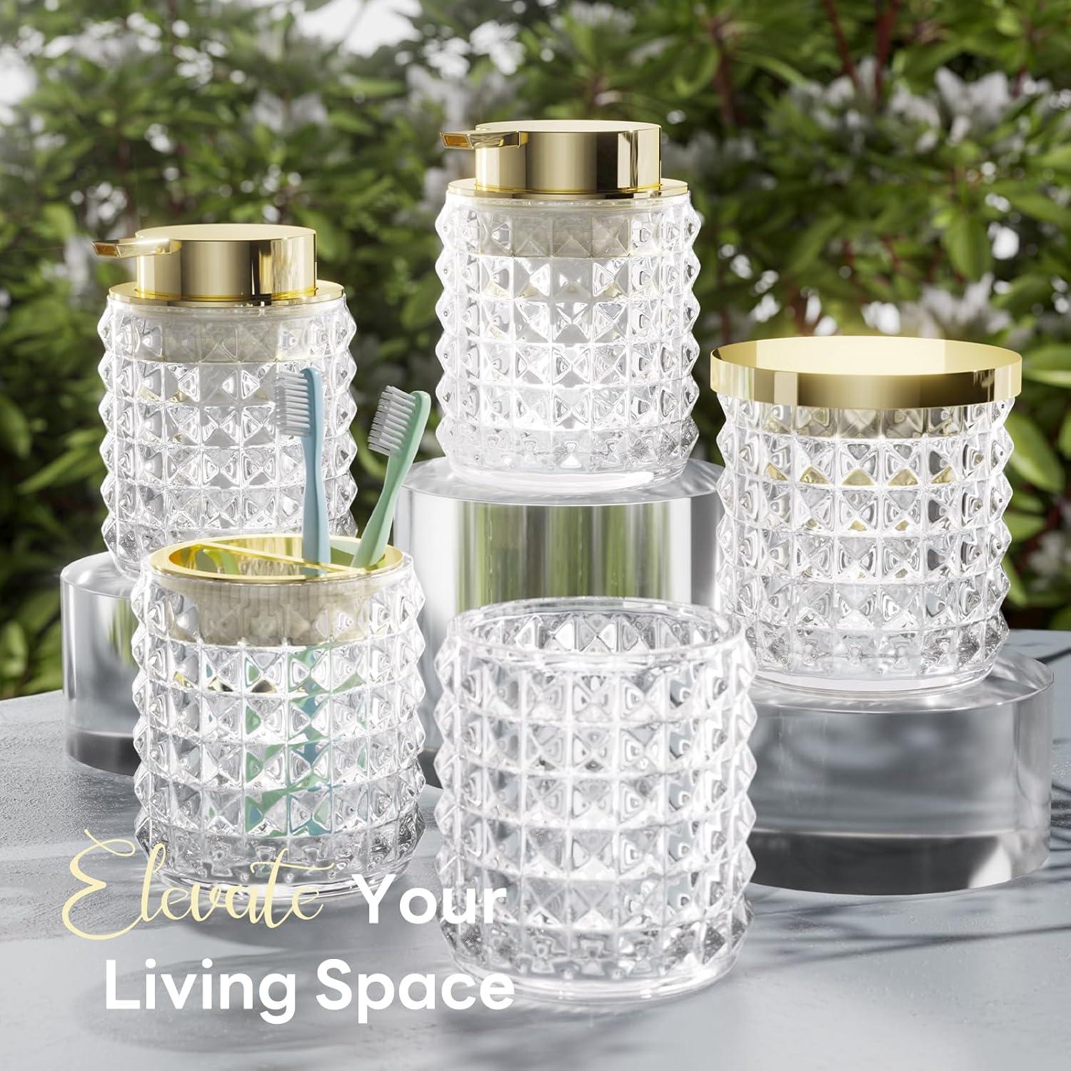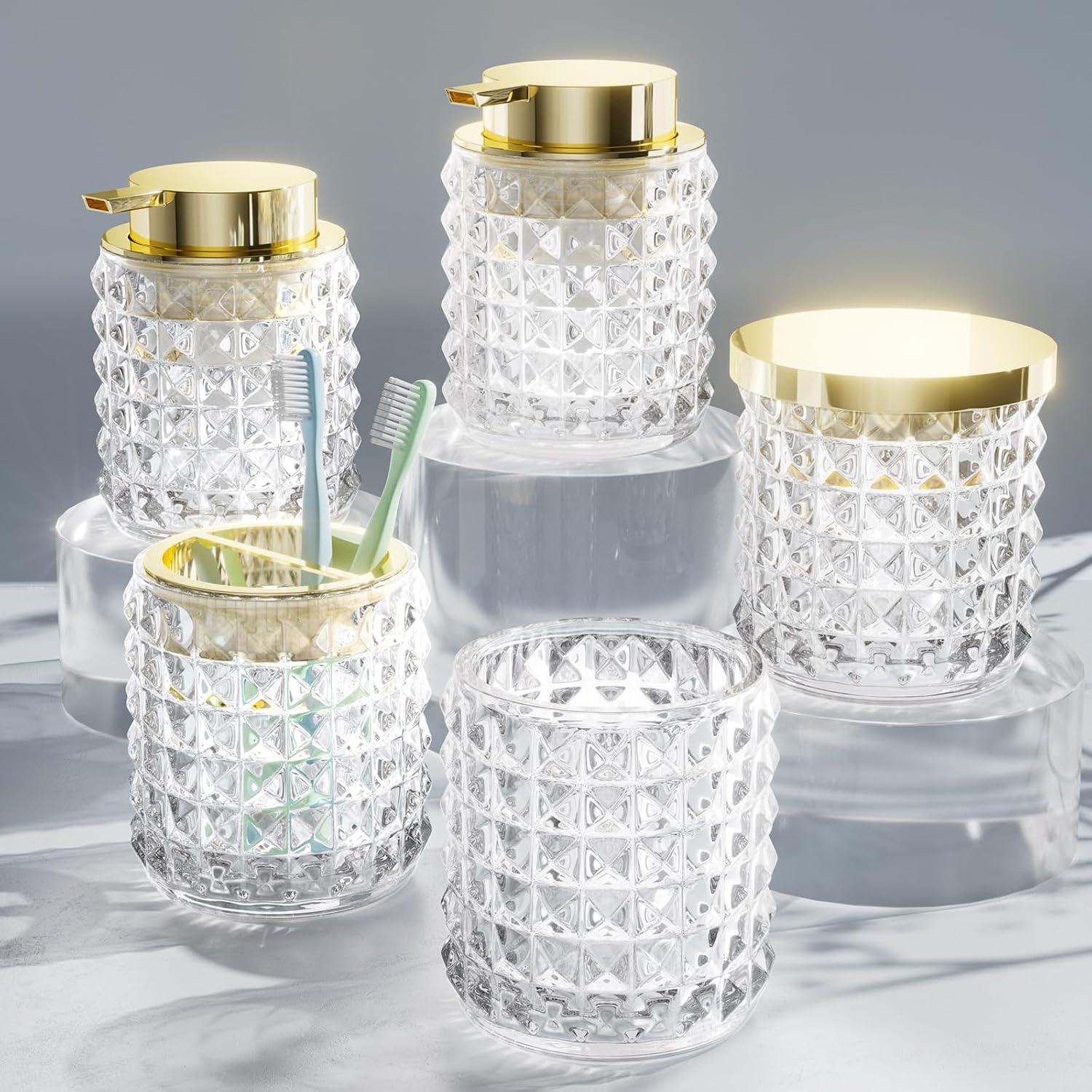 Bathroom Set Pink Bathroom Accessories Set Glass Bathroom Accessories Pink Bathroom Accessory Diamond Soap Dispenser and Toothbrush Holder Sets for Bathroom Decor(Clear+Beige)
