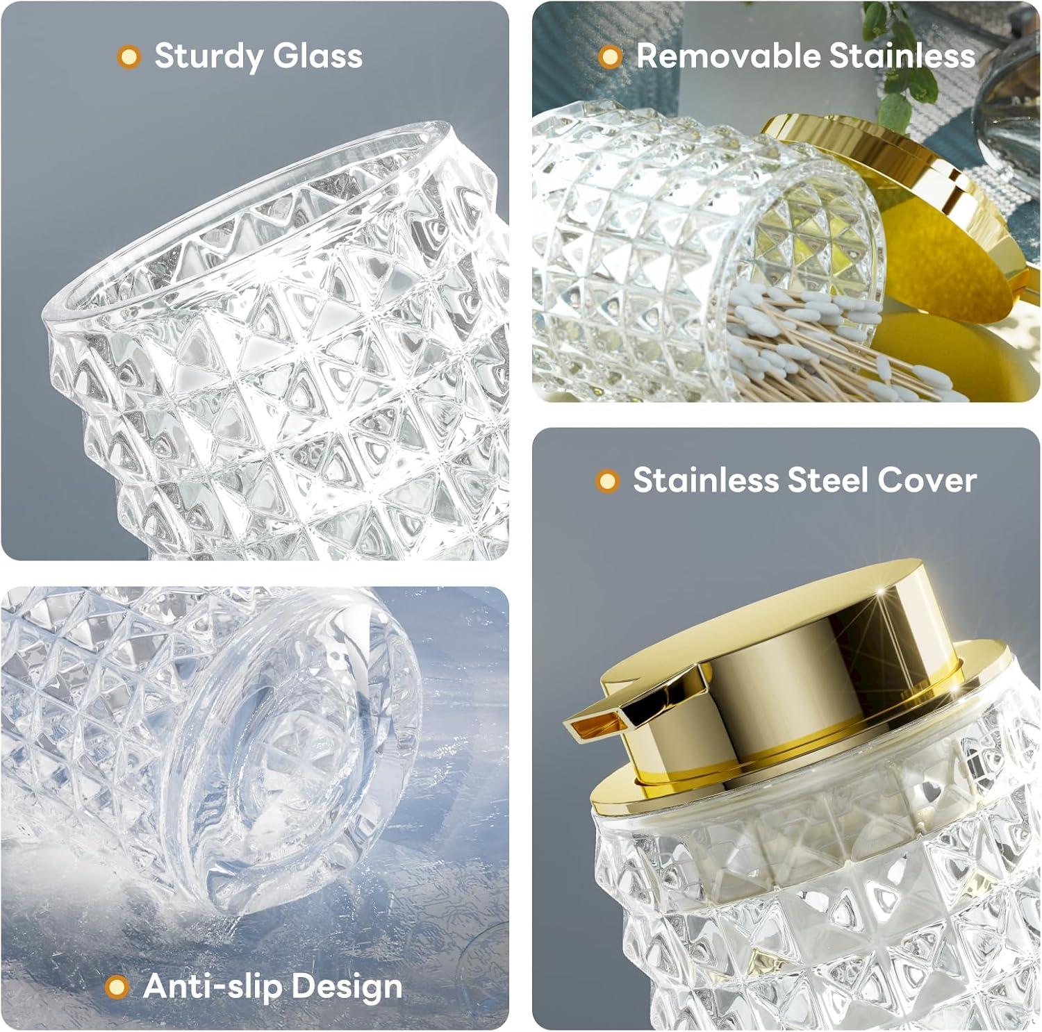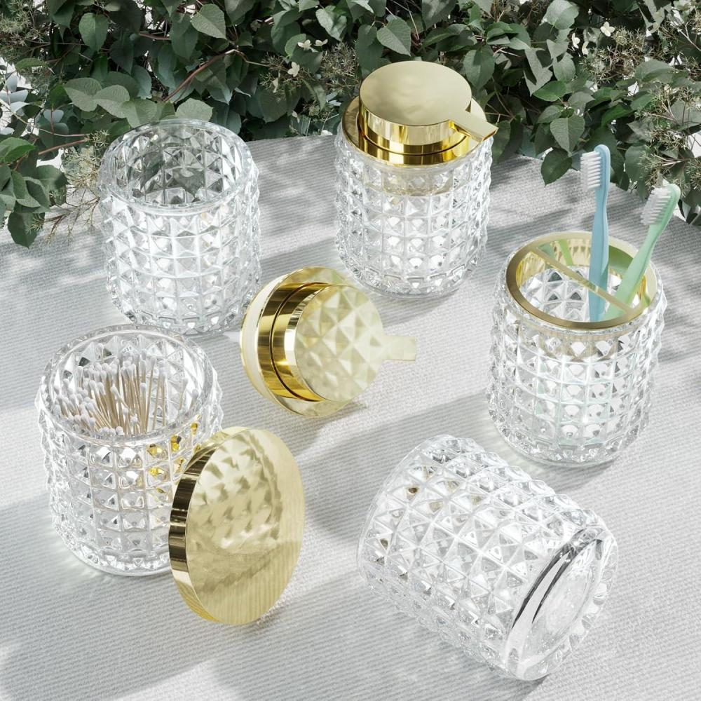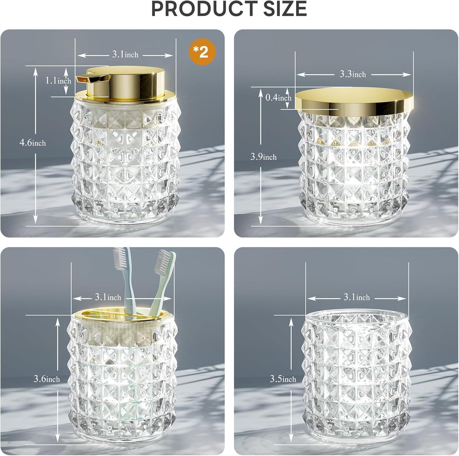 Luxurious & Durable: Our modern glass bathroom accessories set are made from thick, durable glass, providing a luxurious and sturdy feel compared to fragile ceramic or low-quality plastic options. The substantial weight, along with the golden ABS pump, guarantees stability and prevents tipping or breakage