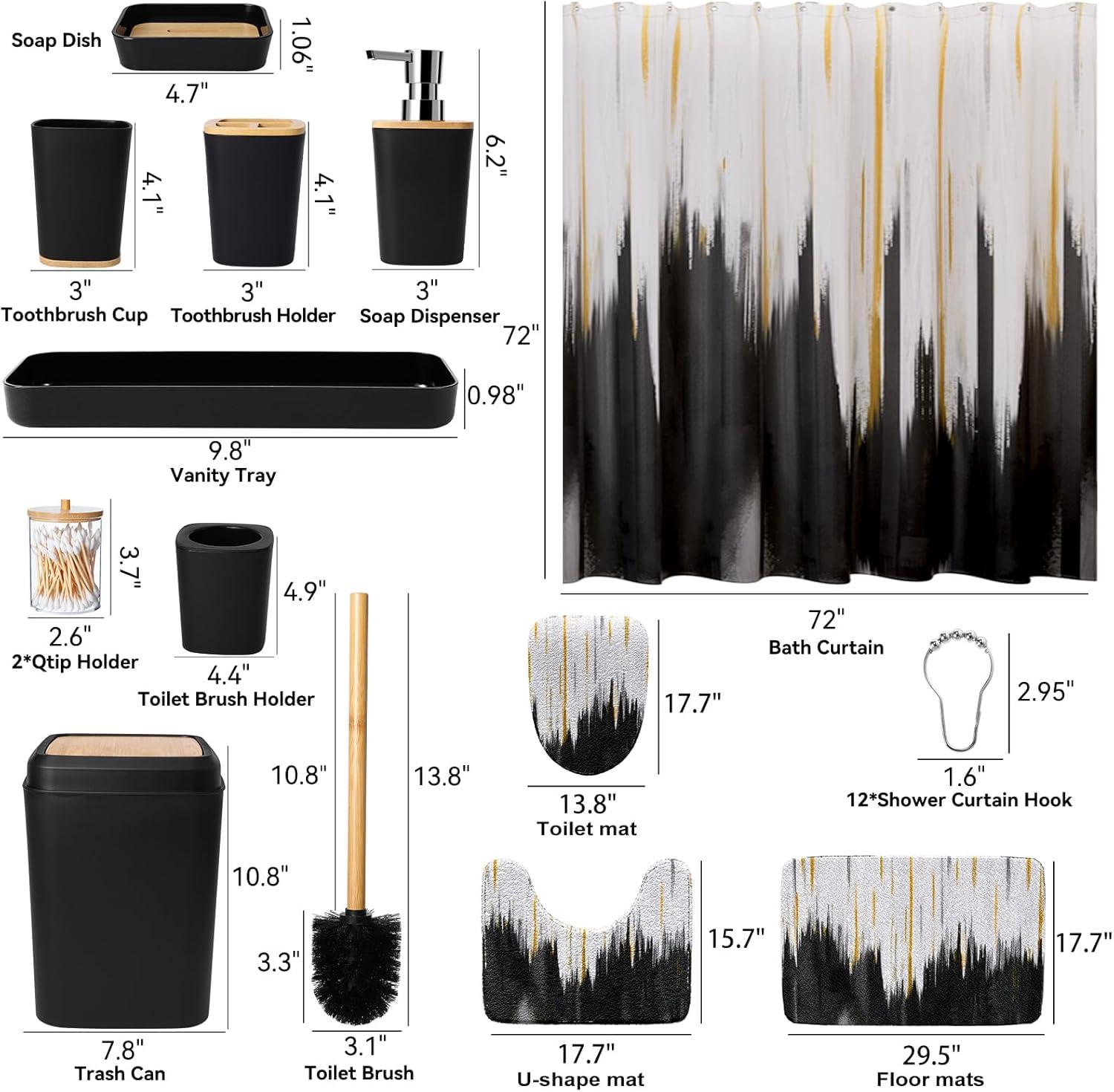 BATHROOM ACCESSORY SET COMPLETE with SEQUIN SHOWER CURTAIN: The perfect bathroom accessories set,including70.8″Lx70.8″ W shower curtain with 12 hooks,19.6″x31.5″ mat, 15.7″x23.6″ mat, lotion soap dispenser, toothbrush holder, toothbrush cup, Vanity Tray, soap dish, trash can, toilet brush,2 *Qtip holder. The bathroom accessories sets will take your bathroom to a new level of design and comfort.