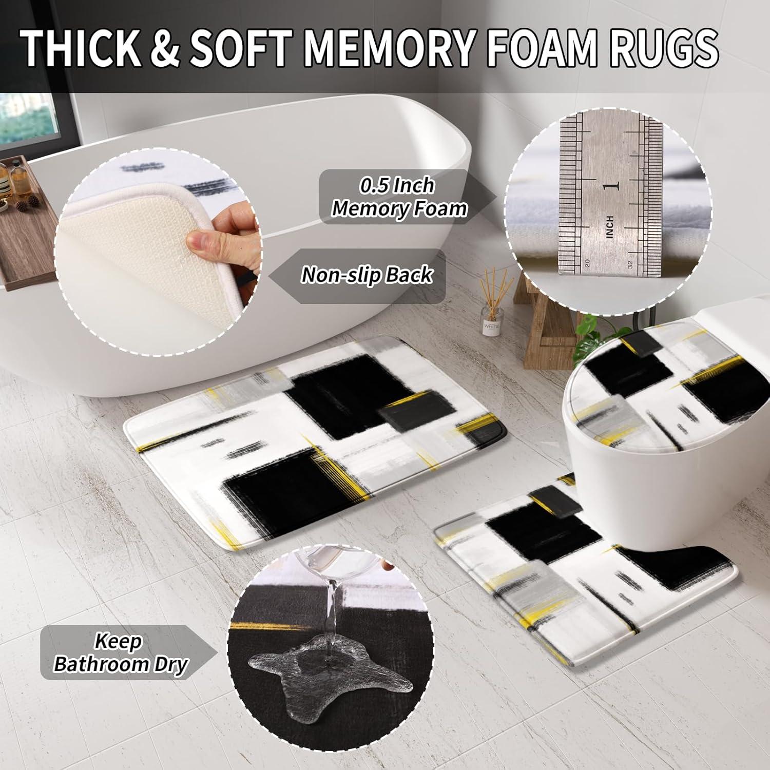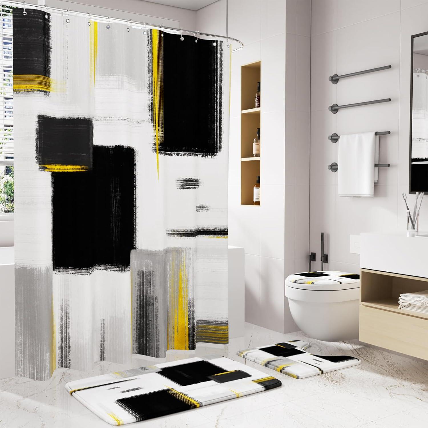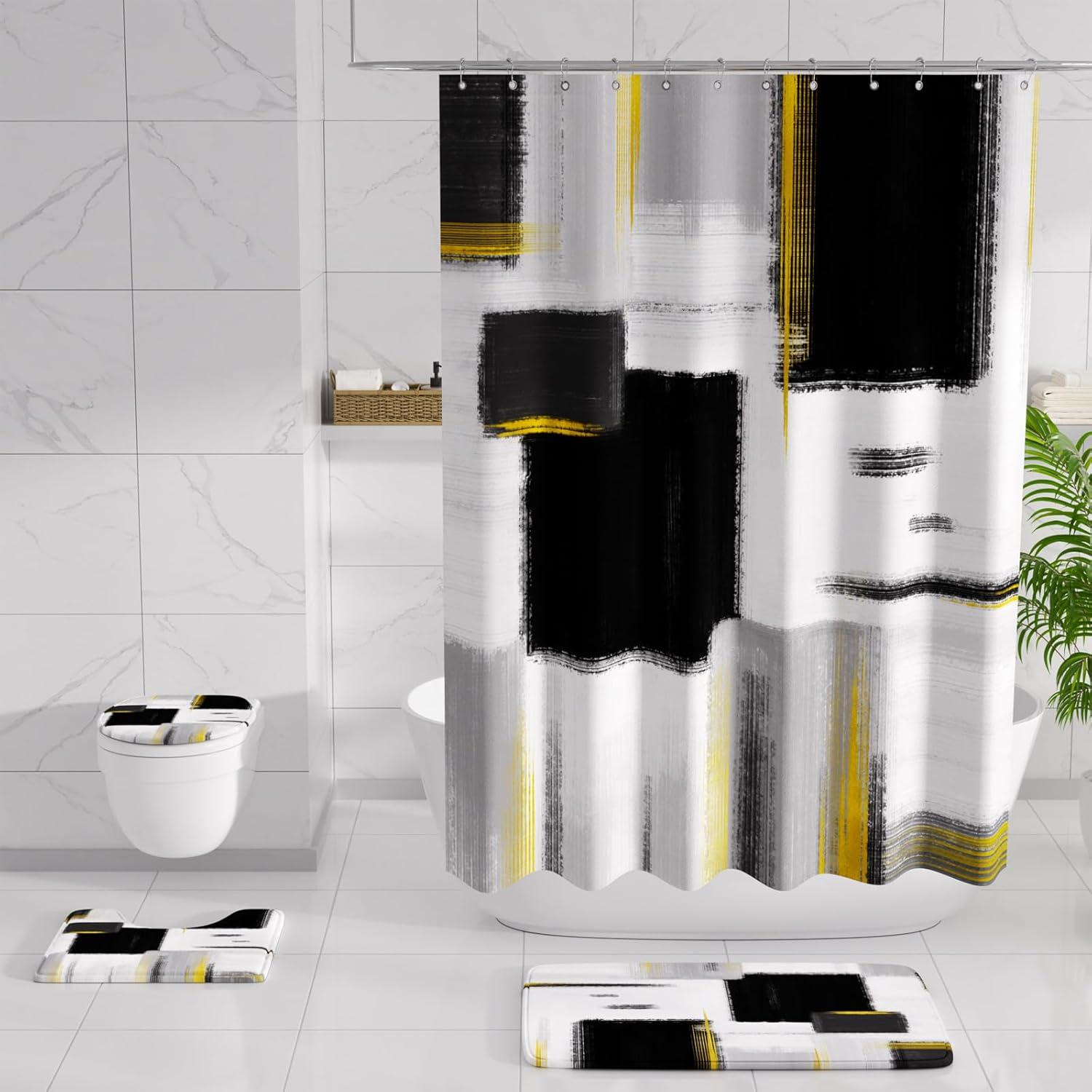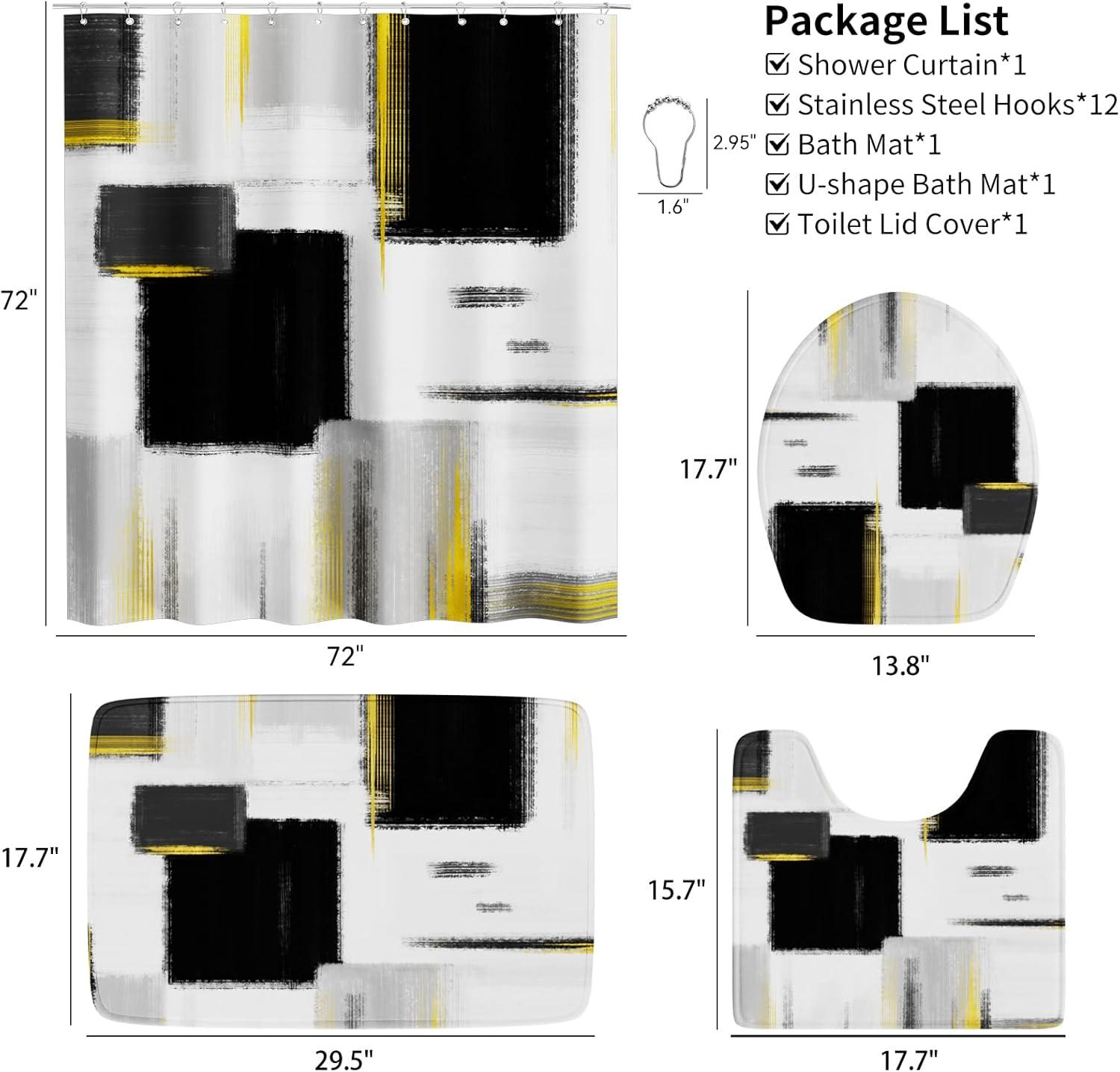 Bathroom Sets with Shower Curtain and Rugs: Bathroom set includes 1pcs 72 x 72 inch shower curtain, 1pcs 29.5 x 17.7 inch bath mat, 1pcs 17.7 x 15.7 inch U-shaped rug, 1pcs 17.7 x 13.8 inch toilet seat cover, 12Pcs stainless steel hooks. The ideal size fits the needs of most people bathrooms.