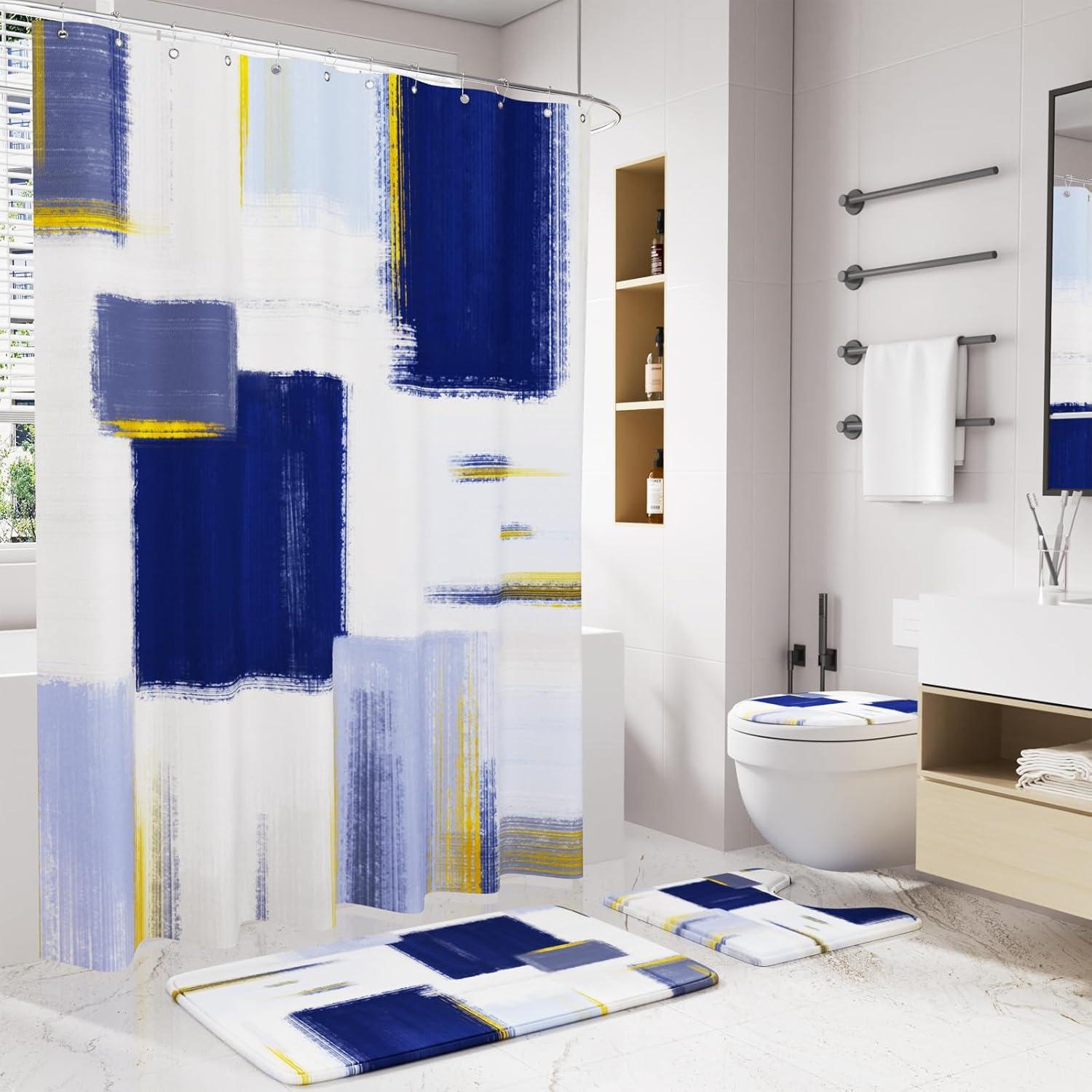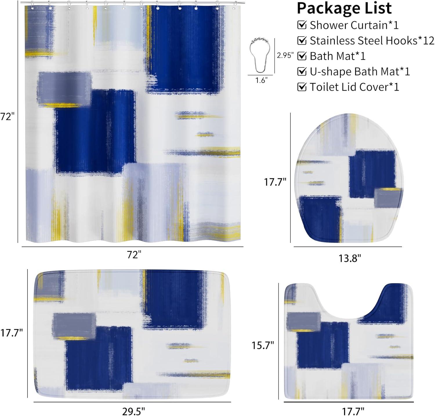 Bathroom Sets with Shower Curtain and Rugs: Bathroom set includes 1pcs 72 x 72 inch shower curtain, 1pcs 29.5 x 17.7 inch bath mat, 1pcs 17.7 x 15.7 inch U-shaped rug, 1pcs 17.7 x 13.8 inch toilet seat cover, 12Pcs stainless steel hooks. The ideal size fits the needs of most people bathrooms.