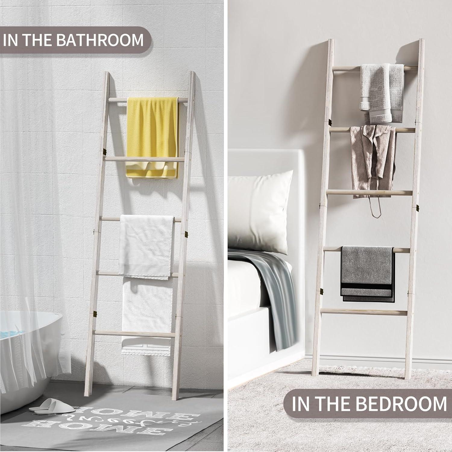 Blanket Ladder for Living Room, 5-Tier Wooden Ladder Shelf, Rustic Decorative Blanket Rack for Blankets, Quilts, Farmhouse Decor Ladder Shelf for Bedroom Bathroom Home Christmas Decor, Black(White)