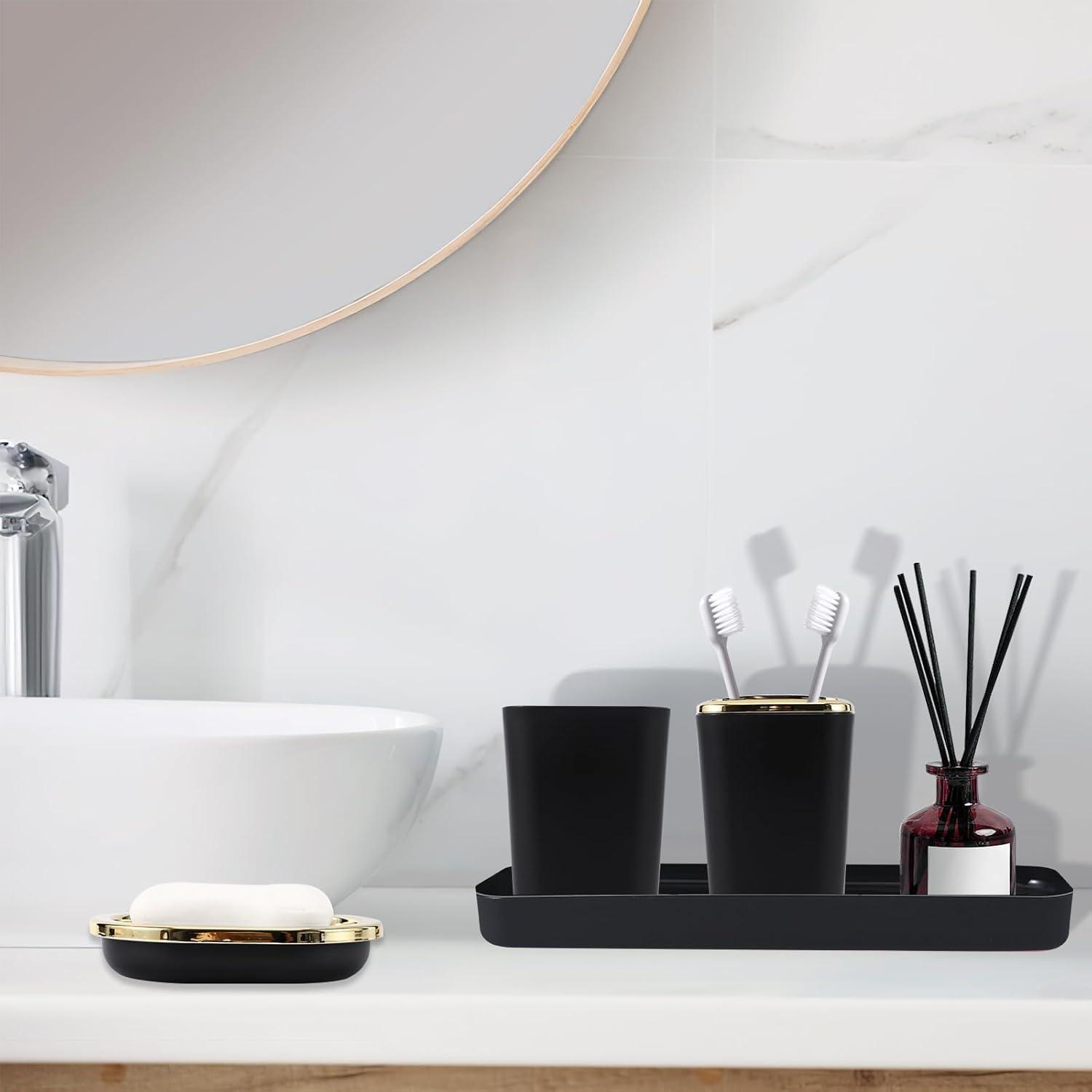 【EASY TO CLEAN AND ORGANIZE】This grey bathroom accessories sets complete is made of environmentally materials that won't emit odors, making it safe for your family and children to use. Bathroom accessories have a smooth surface that is easy to wipe off or hand wash residue. Simply wash with soapy water and a soft cloth to restore cleanliness. The countertop bathroom set with tray can effectively organize your tabletop, so you don't have to worry about it being untidy again.