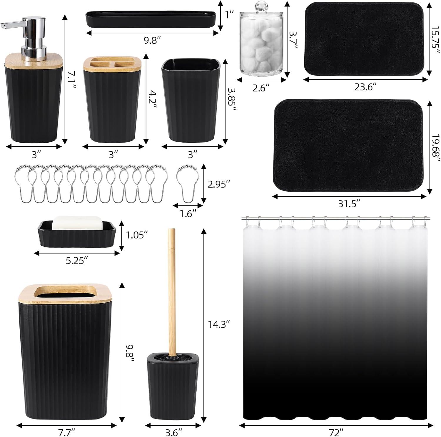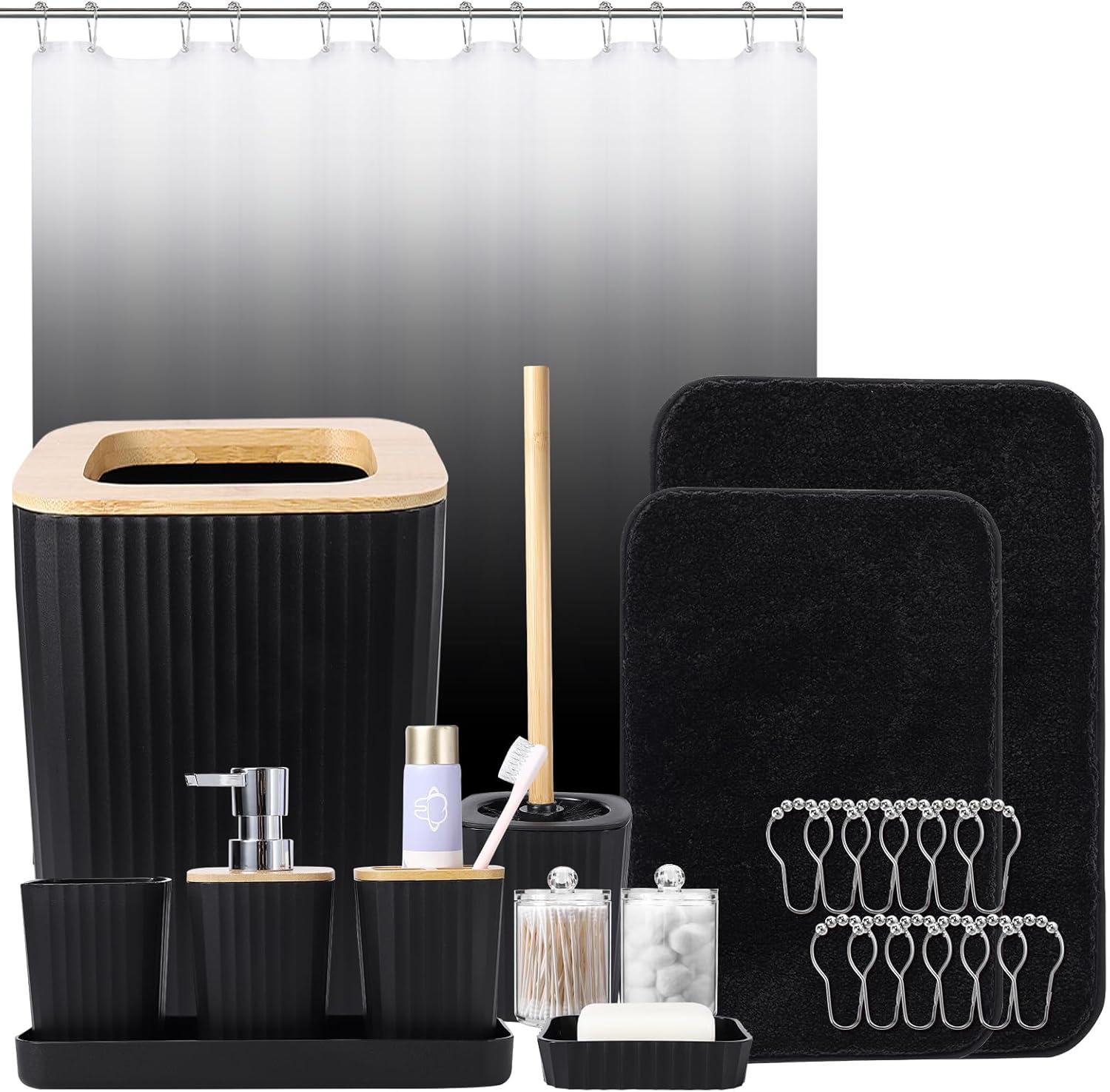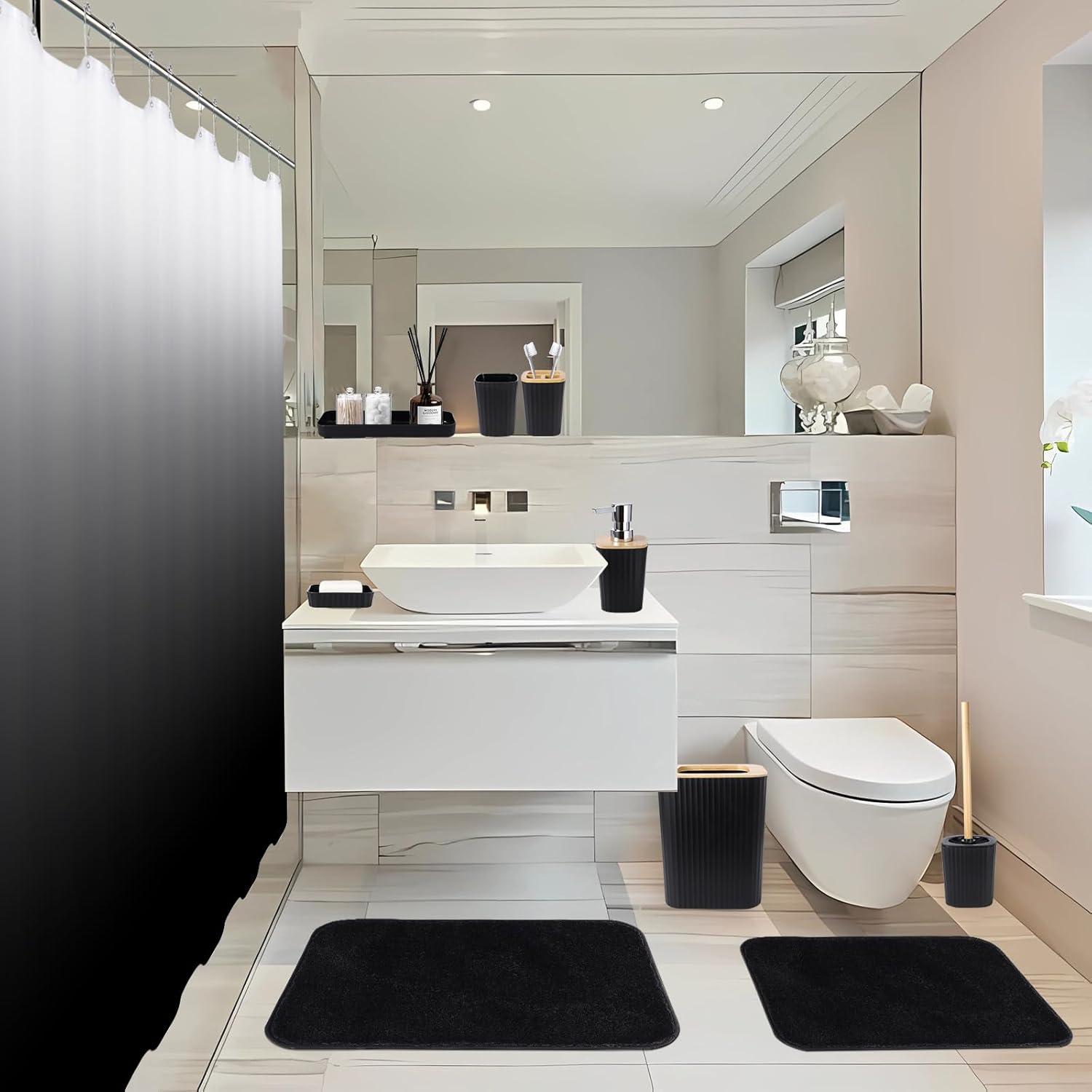 imageGrey Bathroom Accessories Sets Complete 9Piece Bathroom Accessories with Trash Can Vanity Tray Soap Dispenser Soap Dish Toothbrush Holder Toothbrush Cup Toilet Brush and Qtip HoldersHollow Black
