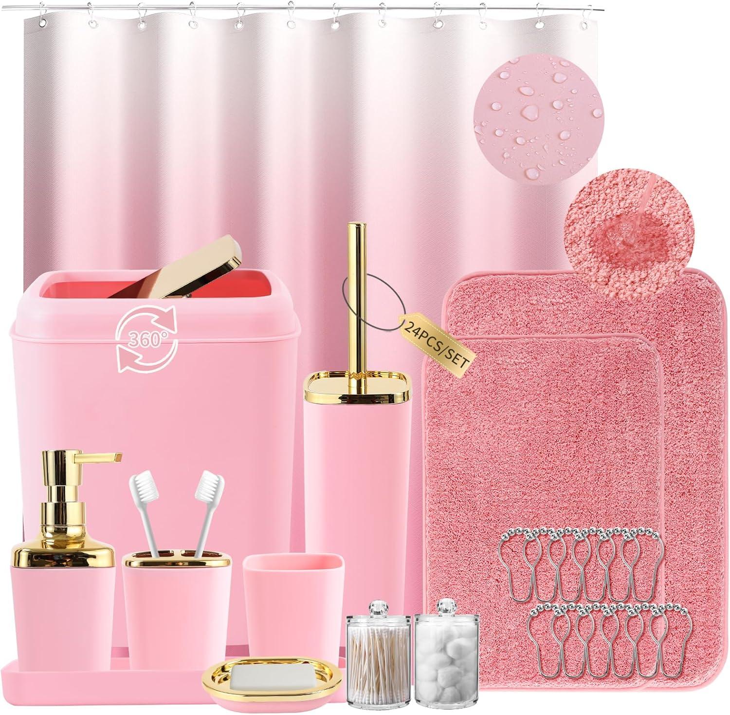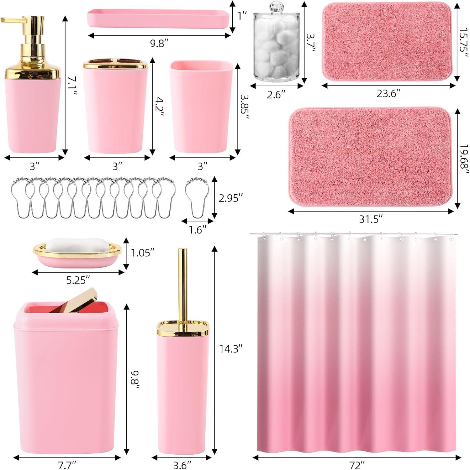 imageGrey Bathroom Accessories Sets Complete 9Piece Bathroom Accessories with Trash Can Vanity Tray Soap Dispenser Soap Dish Toothbrush Holder Toothbrush Cup Toilet Brush and Qtip HoldersPink