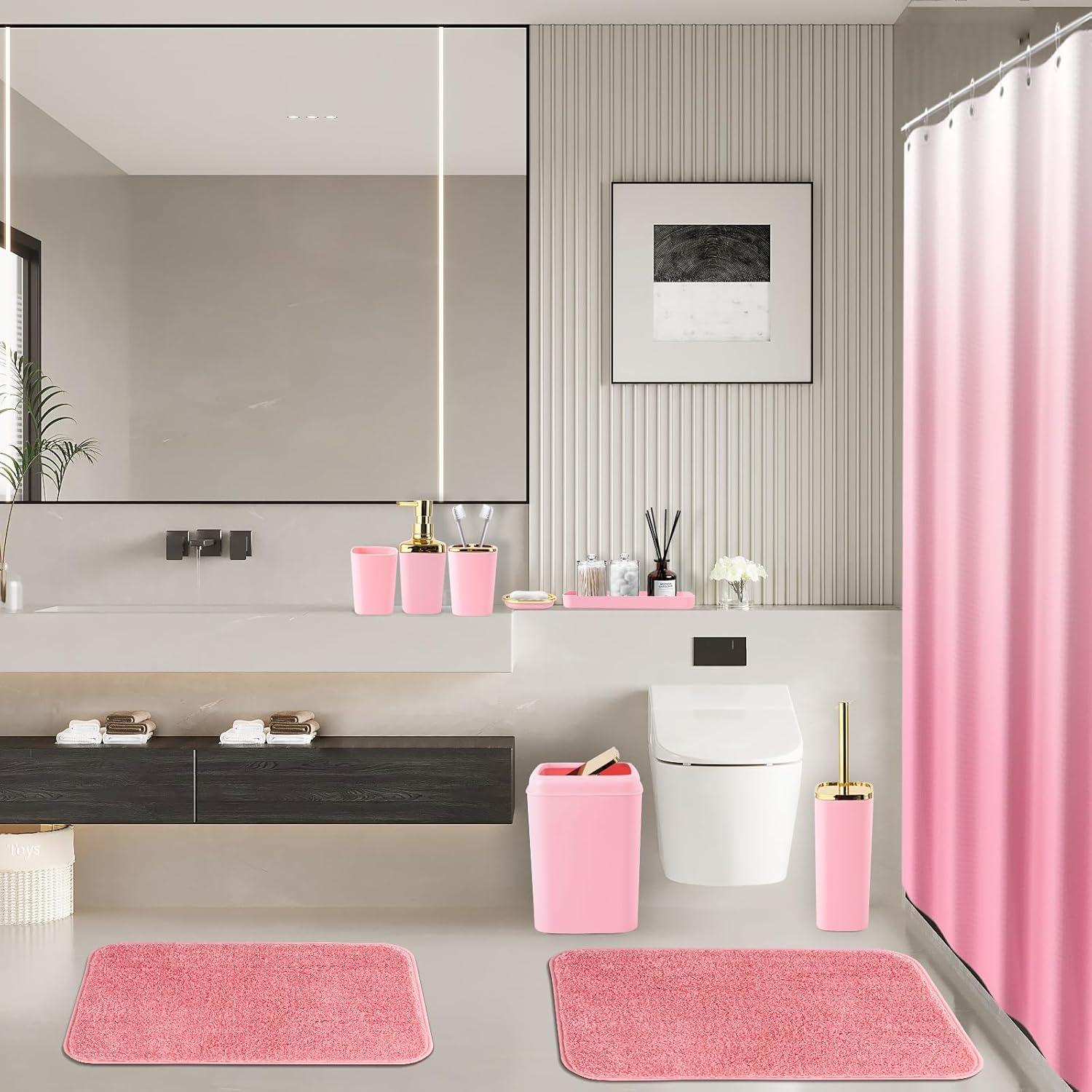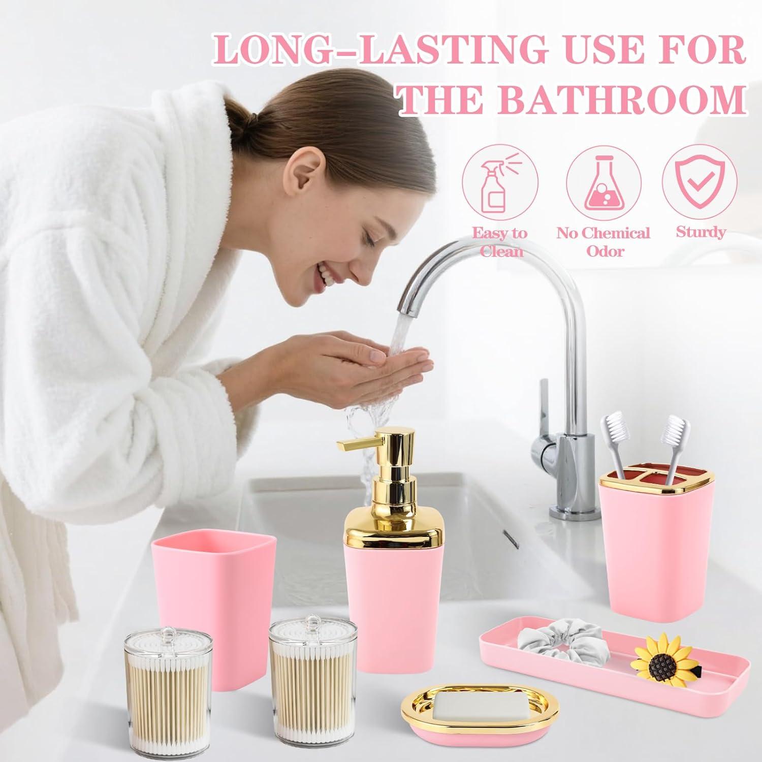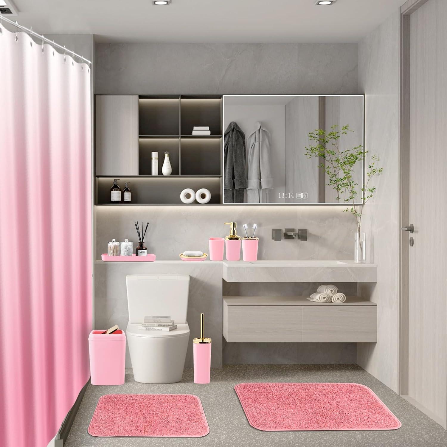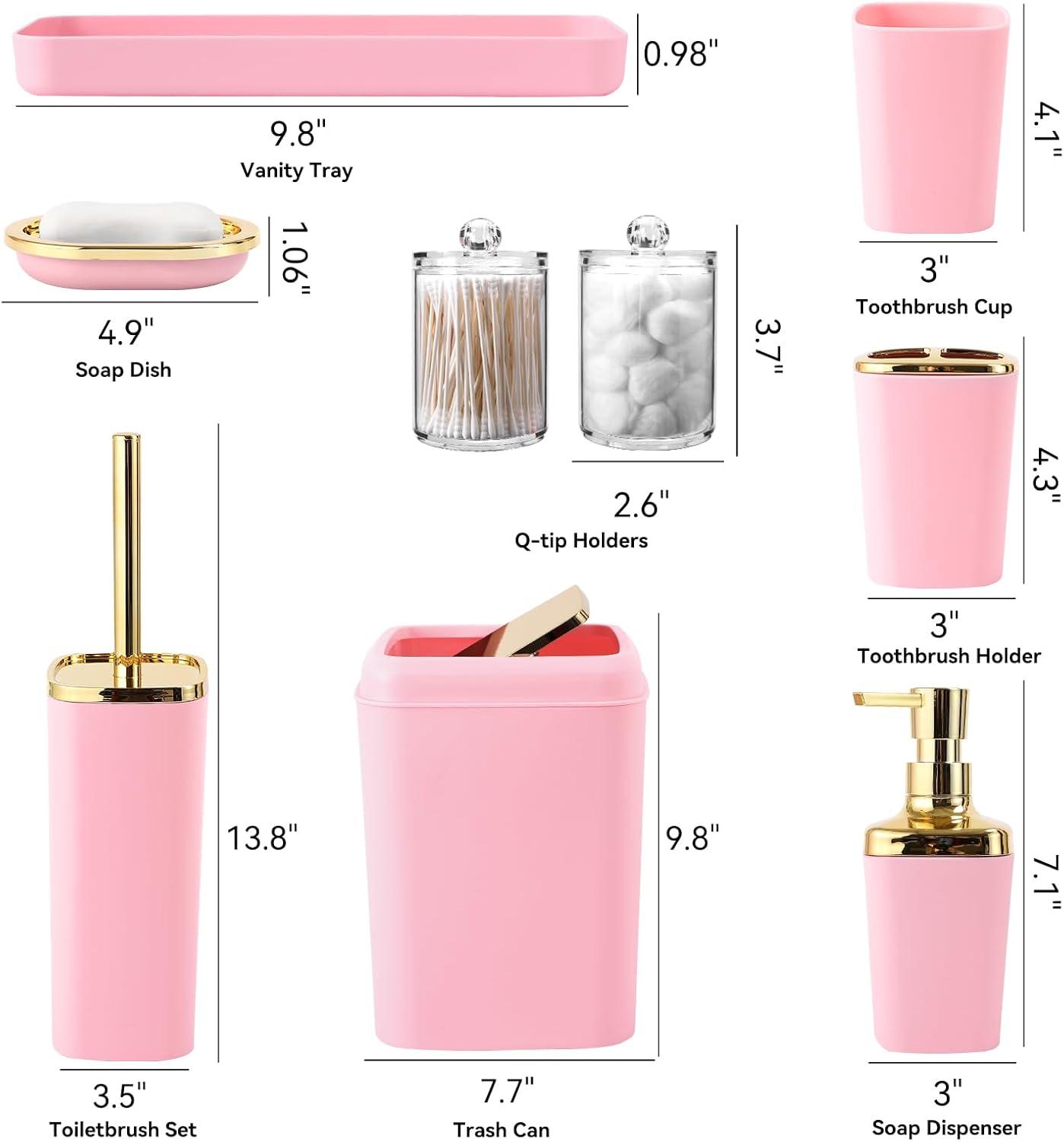 Grey Bathroom Accessories Sets Complete, 9-Piece Bathroom Accessories with Trash Can, Vanity Tray, Soap Dispenser, Soap Dish, Toothbrush Holder, Toothbrush Cup, Toilet Brush and Qtip Holders(Pink)