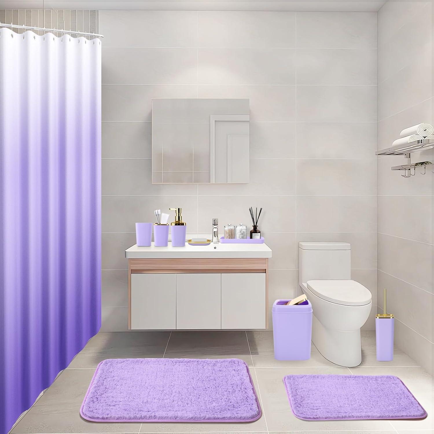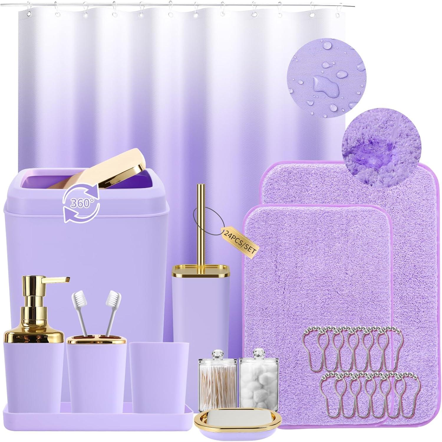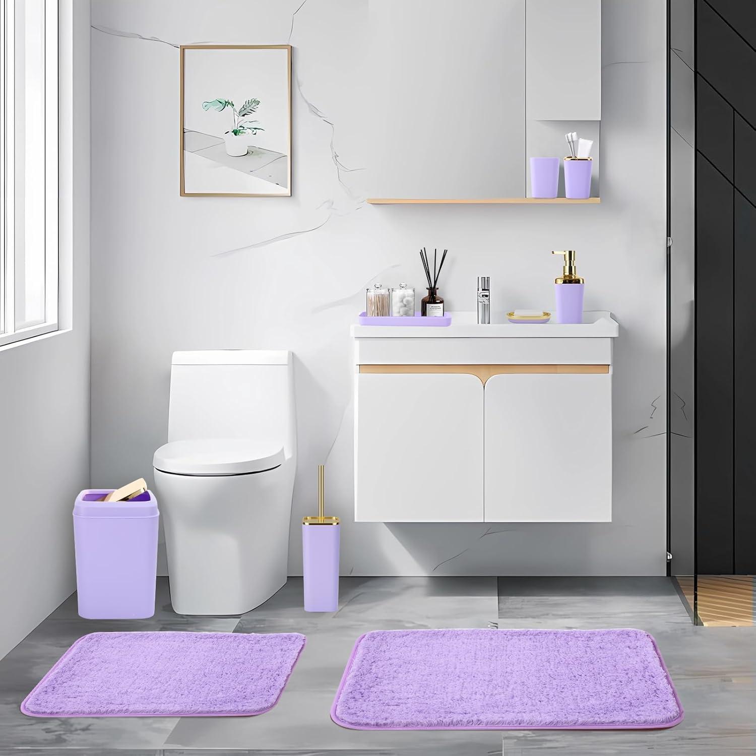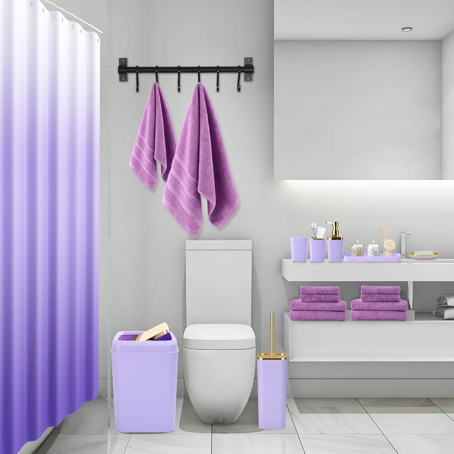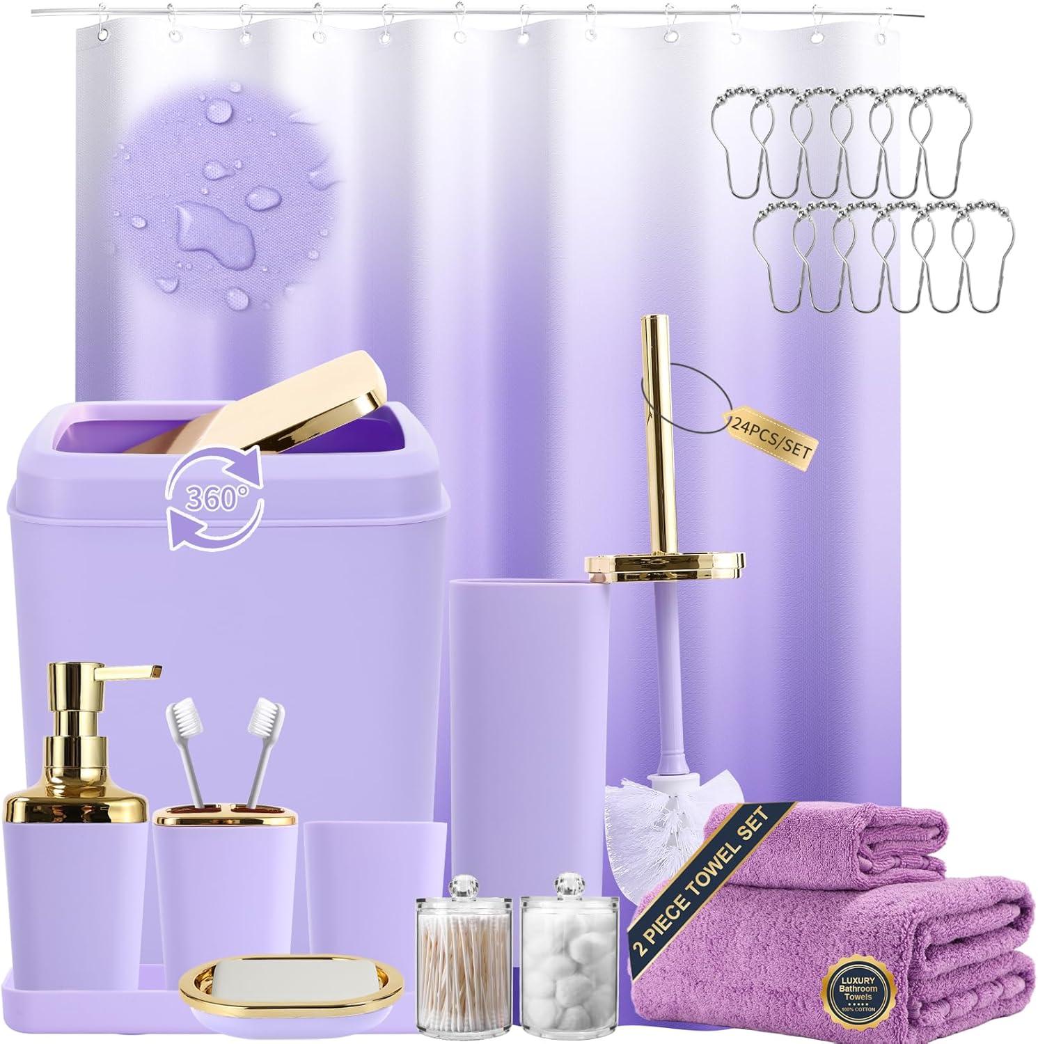 Grey Bathroom Accessories Sets Complete, 9-Piece Bathroom Accessories with Trash Can, Vanity Tray, Soap Dispenser, Soap Dish, Toothbrush Holder, Toothbrush Cup, Toilet Brush and Qtip Holders(Purple and Gold)