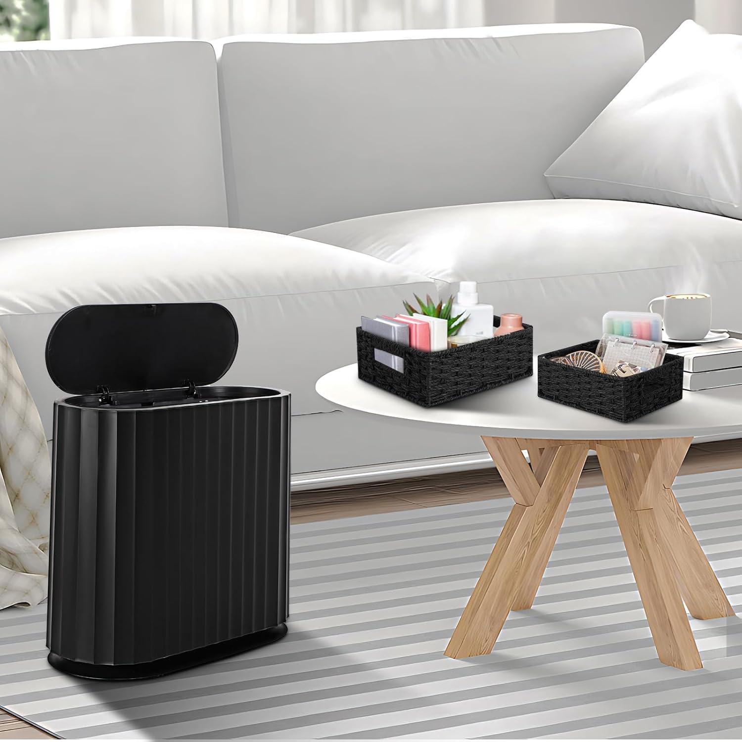 [Convenient Design with Handles for Easy Use]:The woven grey trash can features a spacious opening and side handles, allowing you to effortlessly dispose of trash and carry it with you.Perfectly suited for smaller spaces, it's a super-narrow solution for any corne