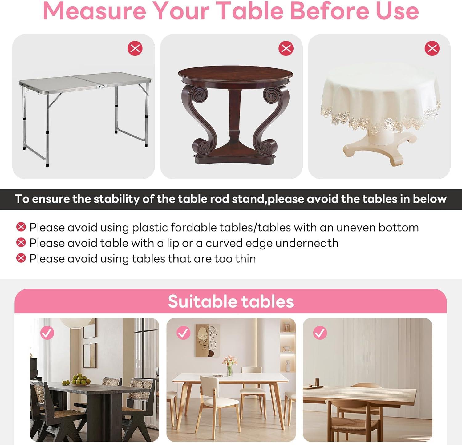 【Easy Assembly】The over the table rod can be easily spirally assembled. Our table arch has only 4 visible screws, making it easy to decorate. Clamp the over table rod onto the table, and adjust and secure the screws according to the size of the table. The threaded structure of the rod is easy to install and remove, with adjustable clamps that save you time and effort during event setup. Portable to space anywhere at your will for indoor and outdoor use