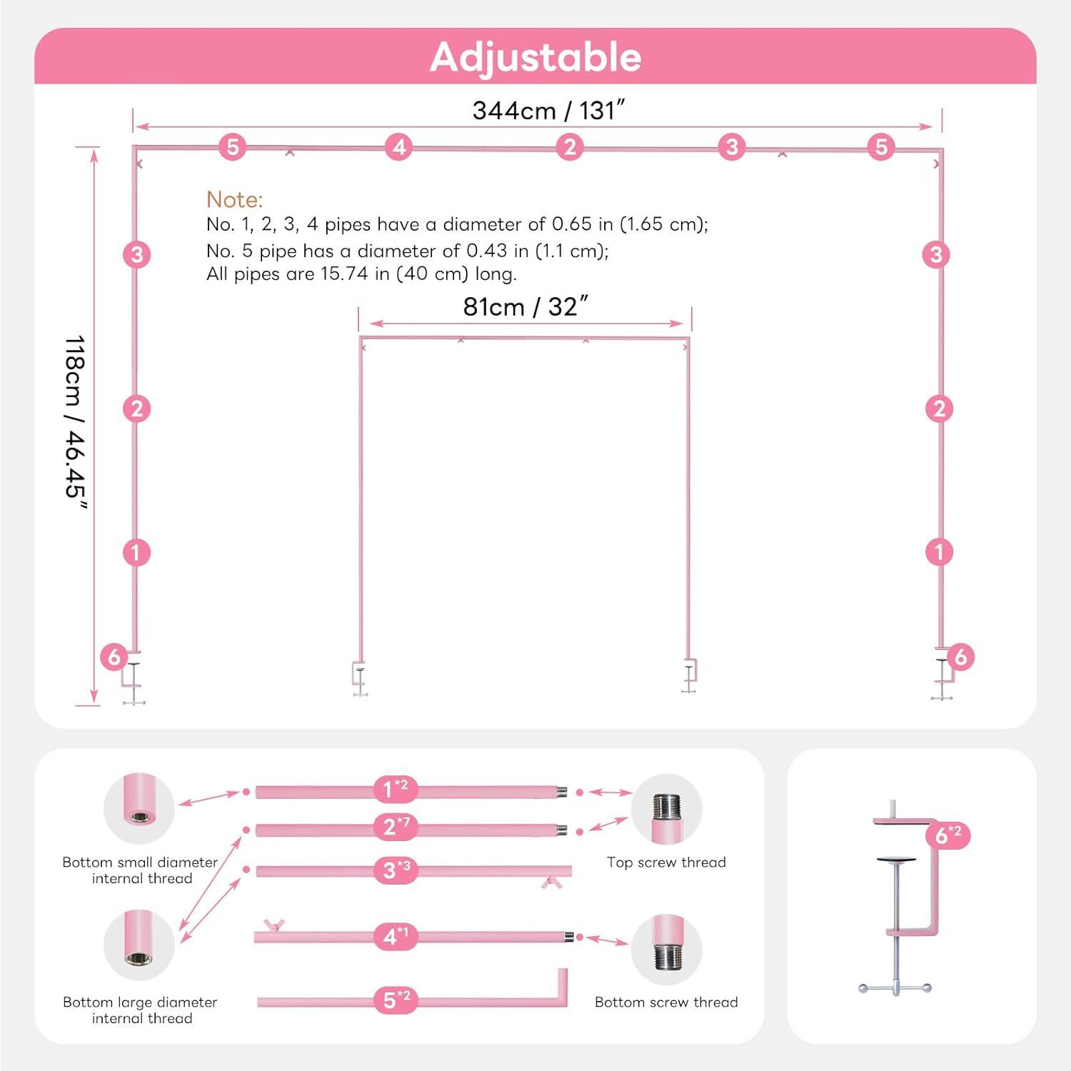 【Adjustable Table Arch Stand Set】The adjustable over-the-table rod stand with clamps has 4 adjustable height ranges: 32 inches, 47 inches, 63 inches, and 79 inches, and the length ranges from 32 to 131 inches, allowing you to adjust both length and height as needed, flexibly. The clamps can attach to tables up to 2.75 inches thick