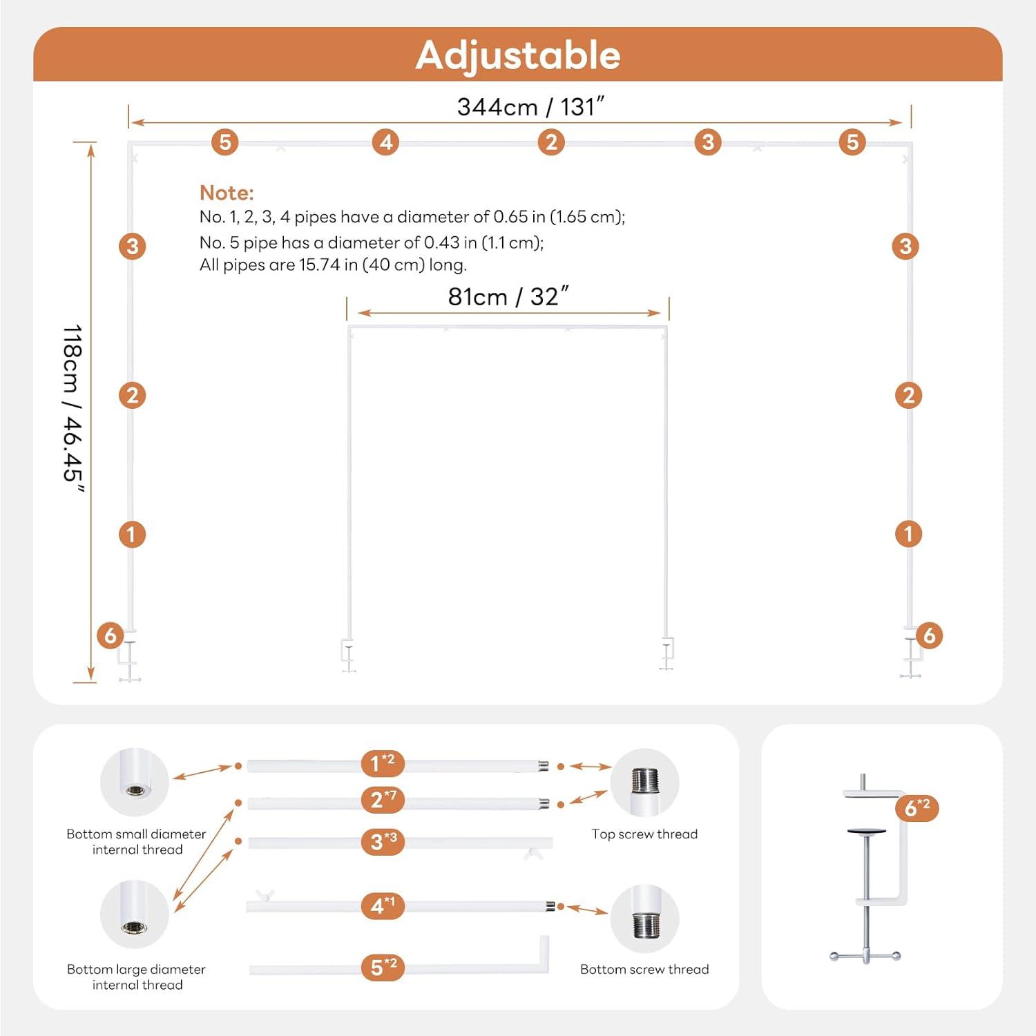 【Adjustable Table Arch Stand Set】The adjustable over-the-table rod stand with clamps has 4 adjustable height ranges: 32 inches, 47 inches, 63 inches, and 79 inches, and the length ranges from 32 to 131 inches, allowing you to adjust both length and height as needed, flexibly. The clamps can attach to tables up to 2.75 inches thick