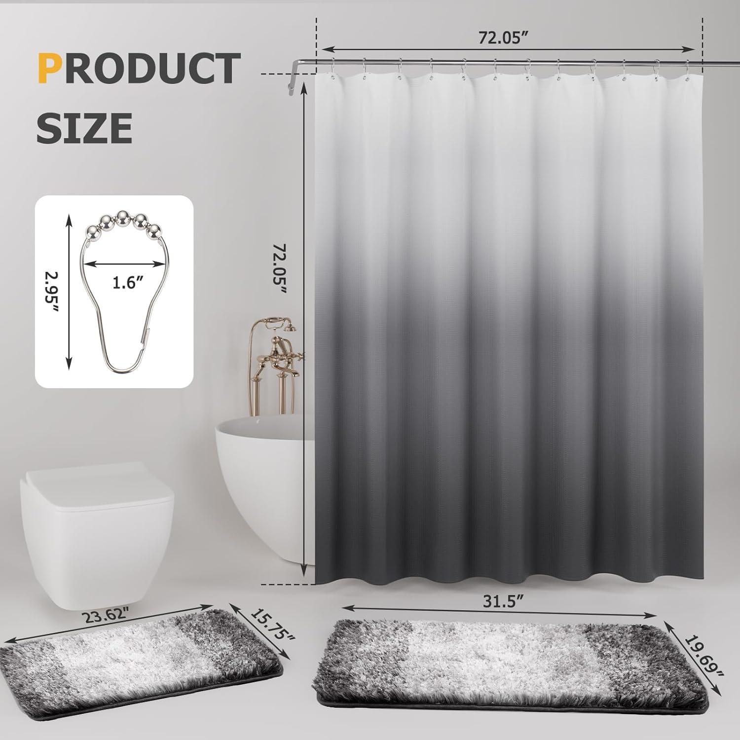 BATHROOM SHOWER CURTAIN with RUGS: Each of our shower curtain set with rugs and accessories,include 1 x Shower Curtain(72″x72″), 2 x Bath Rug Mat(L:19.6″x31.5″, M:15.7″x23.6″) ,18 x Metal Hooks. The ideal size fits the needs of most people bathrooms. Bathroom sets will instantly freshen up a tired bathroom with rich, saturated colors.