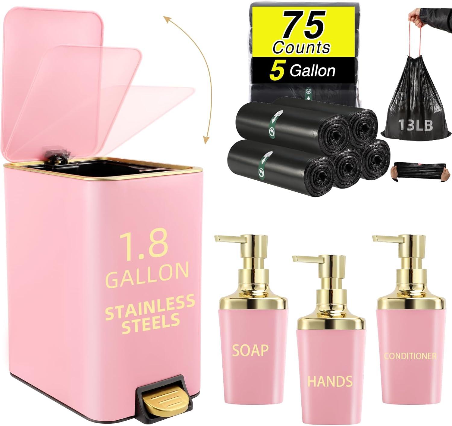 [Package Included]:Trash can,Wicker Storage Baskets,75 Count 5 Gallon Trash Bag,6 Waterproof Tags. each accessory is carefully selected to meet your daily needs.Our black and gold bathroom set is not only practical but also beautiful, making your bathroom space more neat and comfortable